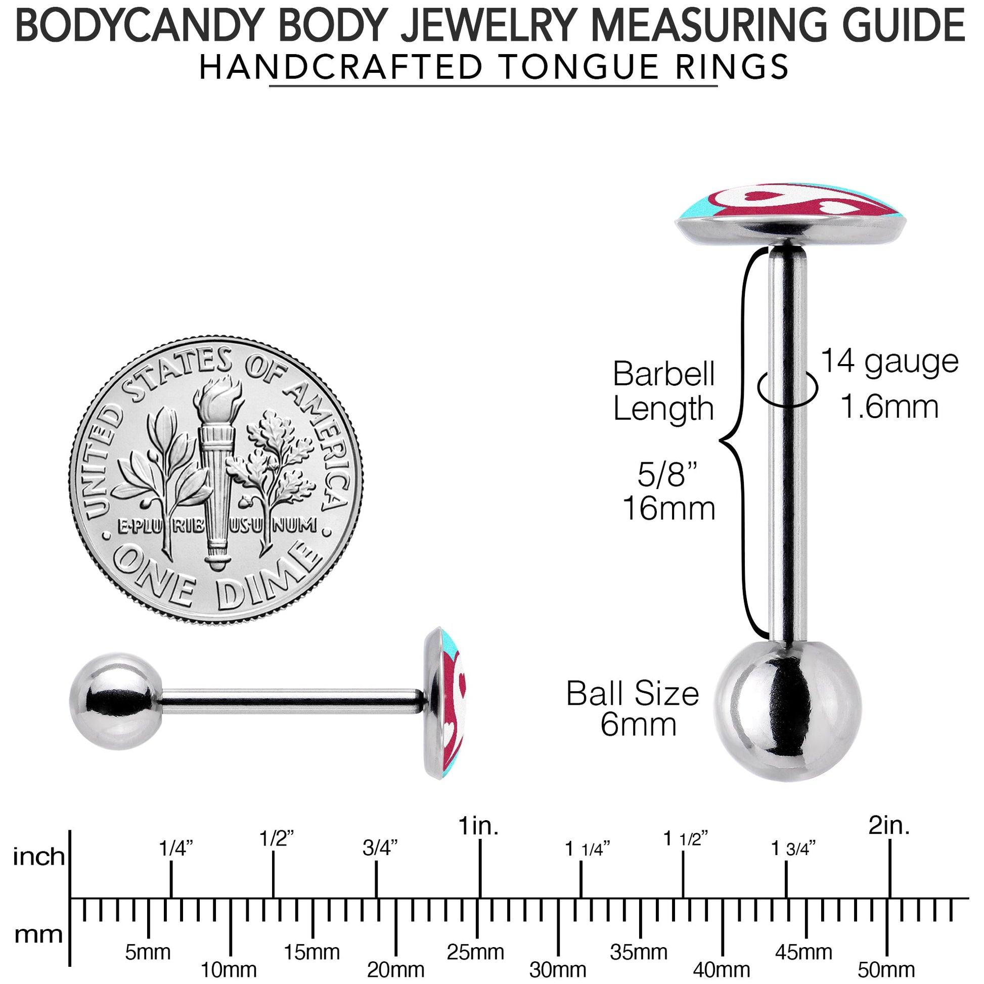 See both sides of love with this 14 gauge tongue jewelry. It is made with a 5/8 inch 316L surgical grade stainless steel straight barbell with a 5mm bottom ball end. The top end features a heart charm, with the inside of the heart featuring a yin yang. The yin yang is red and white and has small hearts inside, instead of the usual round shapes. Love is all give and take and you will get to take style you will love with this yin yang tongue piercing ring.