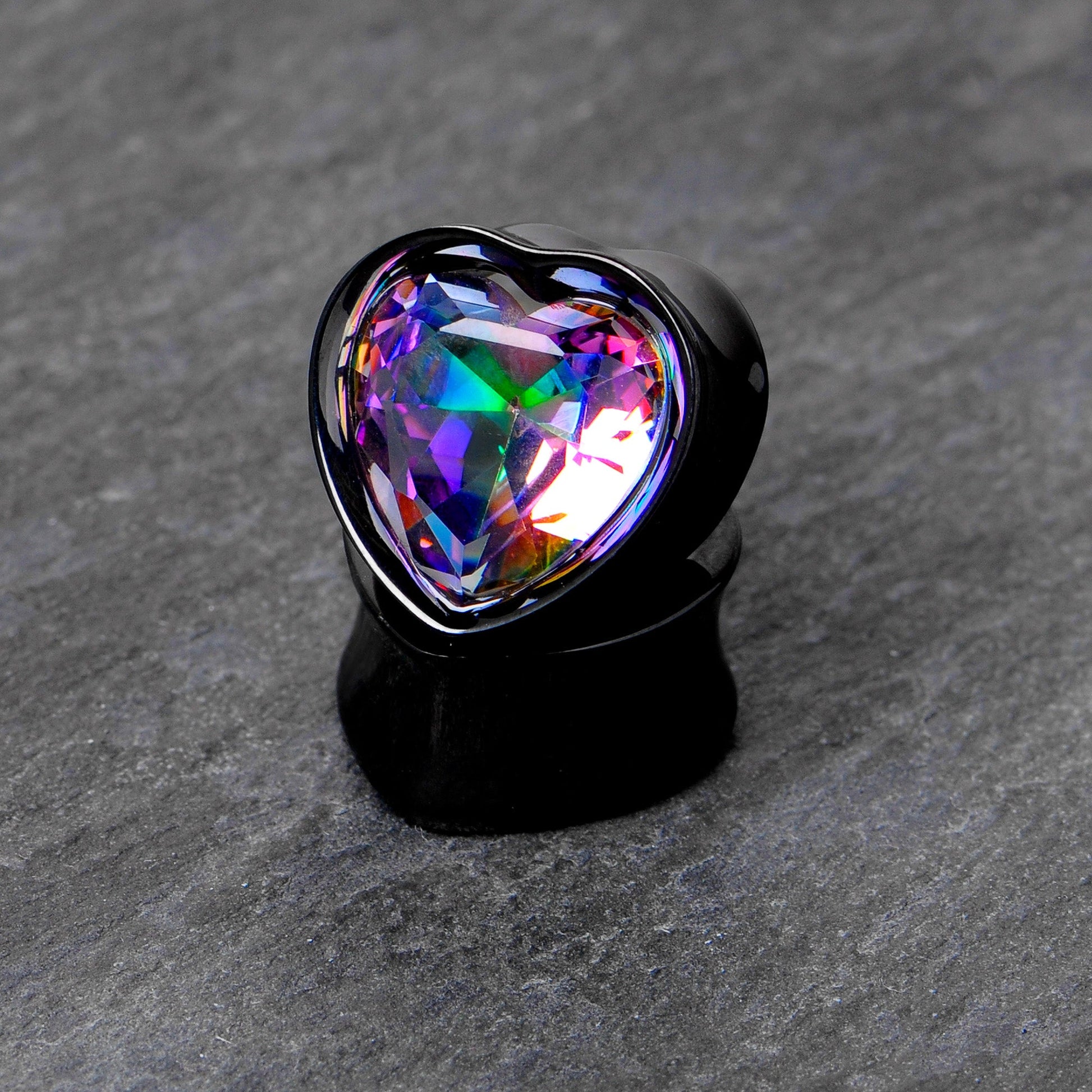Plug your holes with some hearts when you are rocking these heart shaped plugs for stretched lobes. They're made with black PVD over 316L surgical grade stainless steel and feature a color cubic zirconia gem heart in the front. They also feature a double flare design for a secure fit. If you feel like there is a hole in your earlobes that needs some love, fill it with these heart themed ear gauges. Sold as a set of two.Specifications