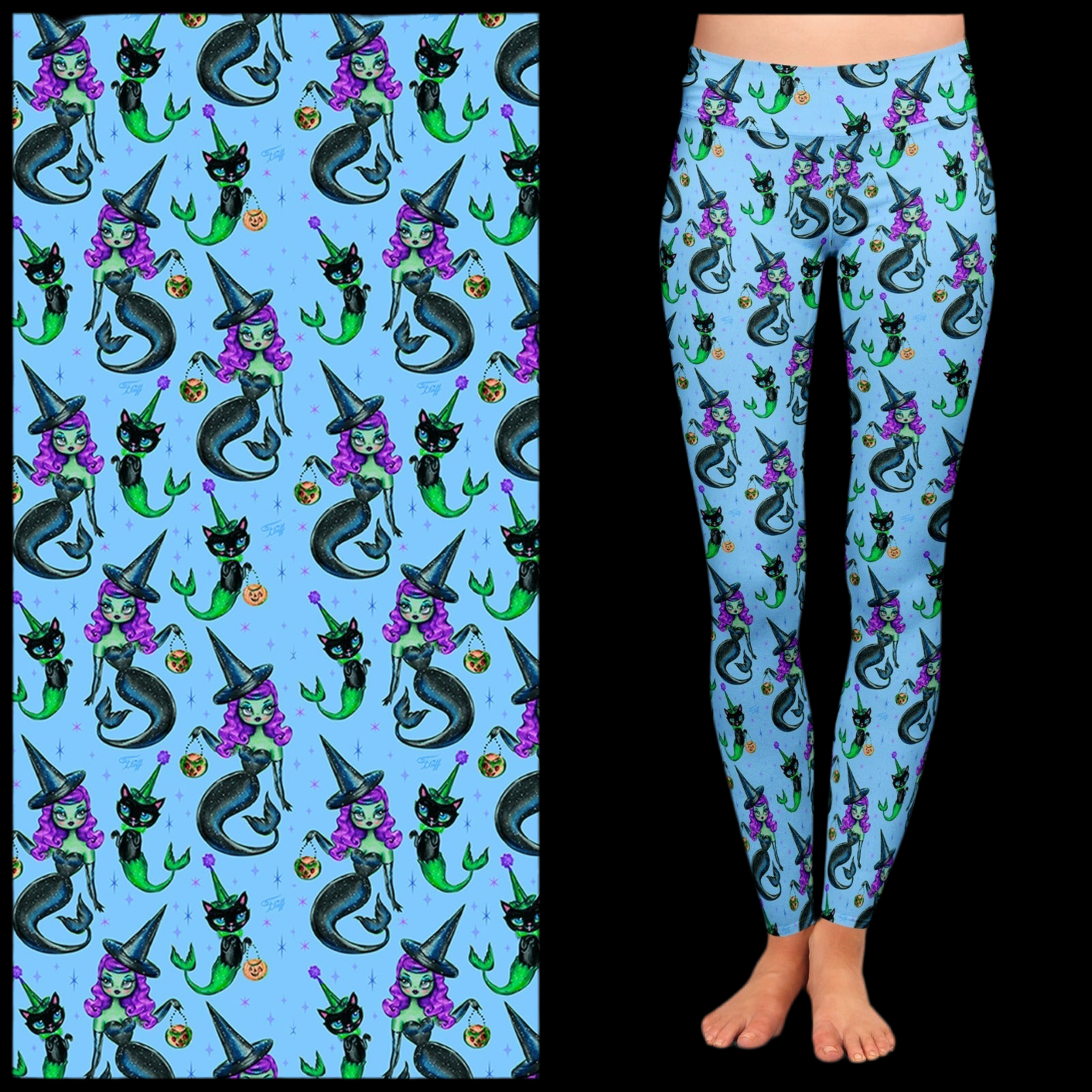 High-Quality, Buttery Soft Leggings feature a vintage-inspired mermaid witch and mercat pattern designed by Miss Fluff.