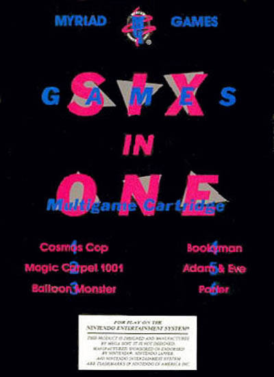 Six of the newest video games in one amazing cartridge, for the price of one! COSMOS COP: Action packed space war game with 6 levels. High skill necessary. MAGIC CARPET 1001: Catch the treasure of the Magic Lamp to win the game. Play through 4 exciting levels. BALLOON MONSTER: To exchange time with space, hit the bubbles at their highest point. 50 amazing levels. ADAM & EVE: Play through 40 levels, killing all the snakes and catching all the apples, in order to win. PORTER: Test your IQ by moving all the boxes to where the stars are through 25 challenging levels. BOOKYMAN: Clean the streets and keep them clean while trying to stay alive. Eight fun levels!