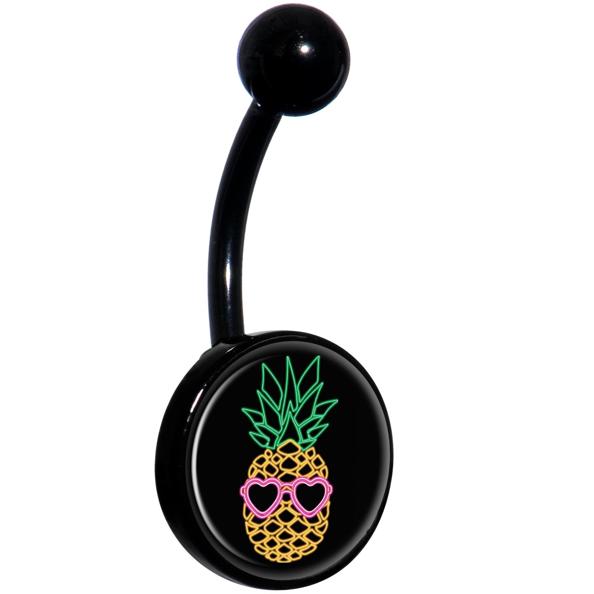 If you love fruity tropical fashion and fun in the summer sun then this 14 gauge navel jewelry is right for you! Made with a 7/16" durable 316L surgical grade stainless steel curved barbell, this belly button ring features a funky tropical pineapple wearing neon pink heart sunglasses on a black background logo inlay.Specifications