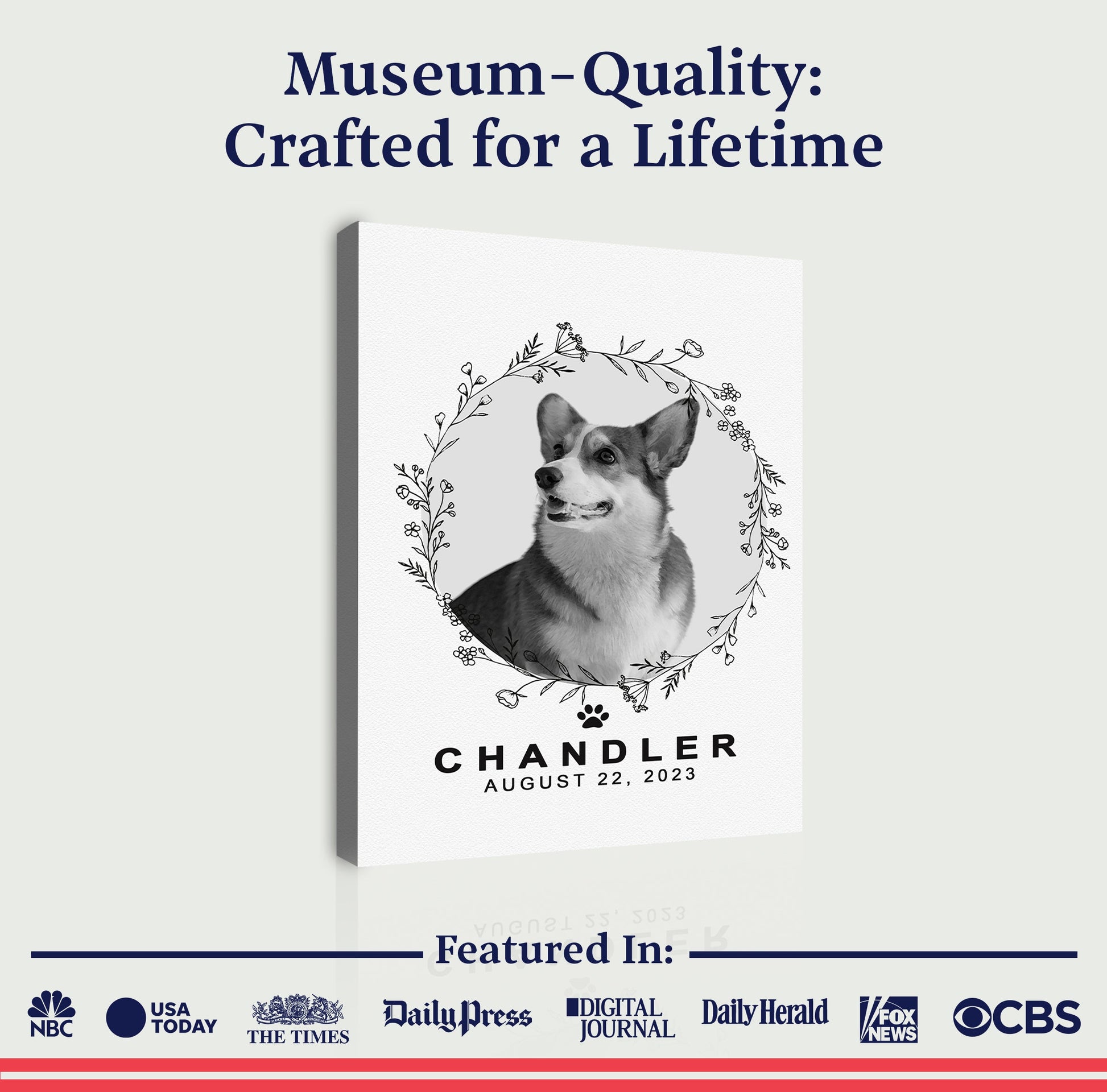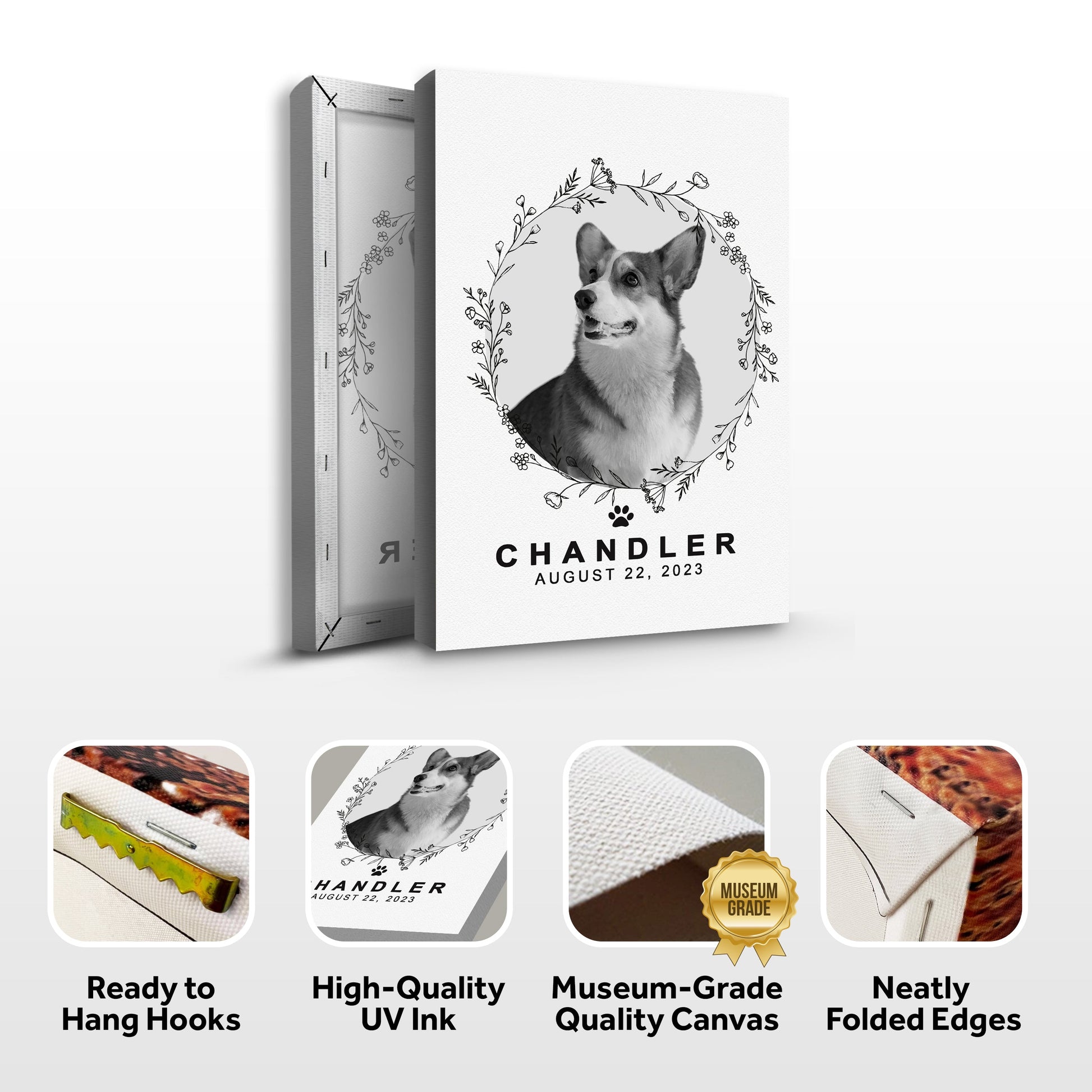 Let the memory of your beloved family member live on with this custom dog memorial pet loss frame portrait. Take comfort in the elegant wood patterns that will complement any photo canvas for any home décor style. Hang this passing gift in your pet's favorite room as a fitting tribute to the happy memories that you once shared.