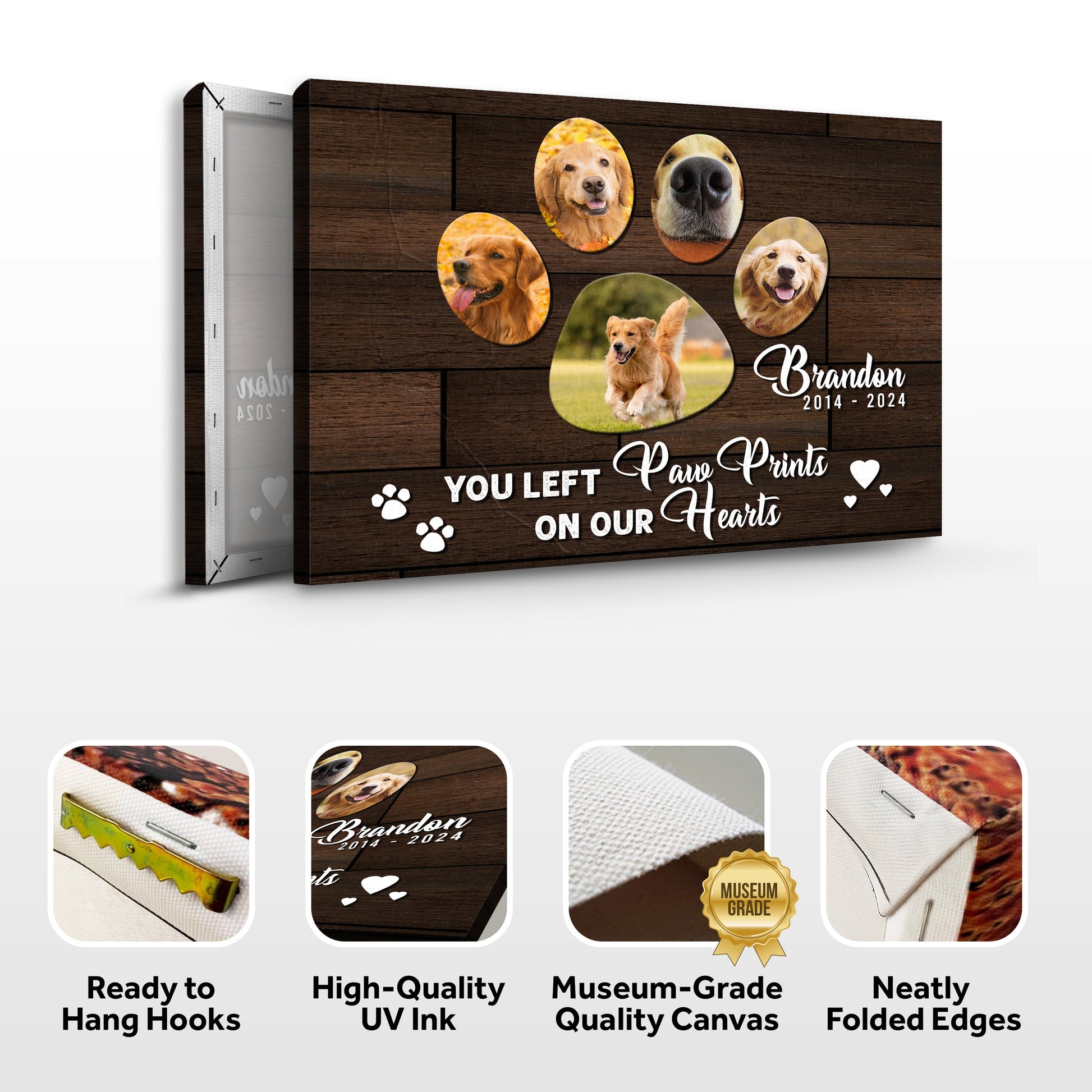 Let the memory of your beloved family member live on with this custom dog memorial pet loss frame portrait. Take comfort in the elegant wood patterns that will complement any photo canvas for any home décor style. Hang this passing gift in your pet's favorite room as a fitting tribute to the happy memories that you once shared.