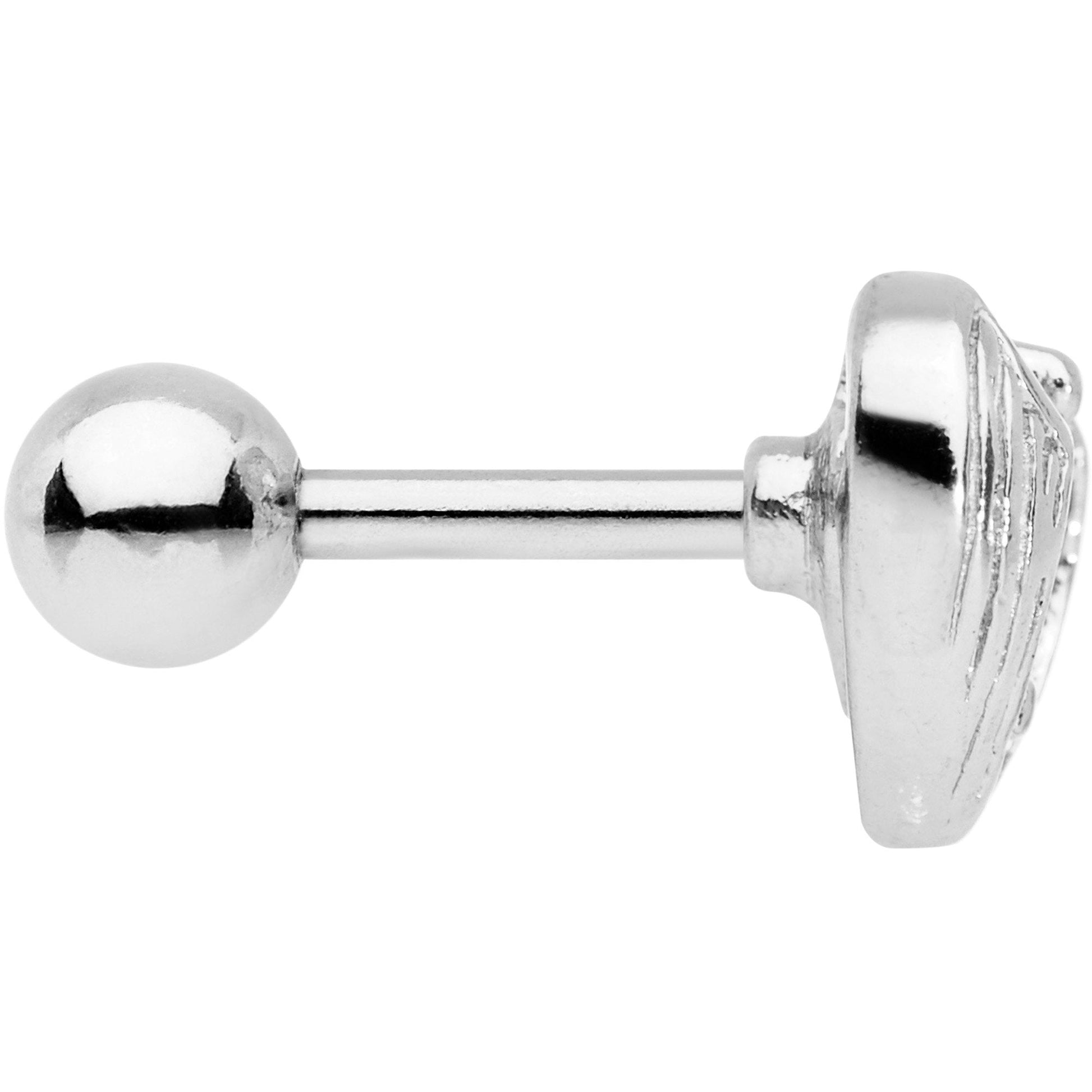The pink cubic zirconia gem on this heart-shaped charm looks like it's being hugged by angel's wings. This 16 gauge cartilage tragus piercing features a heart-shaped charm with a central, smaller heart-shaped cubic zirconia gem. The heart charm is mounted on a 6mm straight barbell made with durable 316L surgical grade stainless steel. Perfect for Valentine's Day or any occasion.Specifications