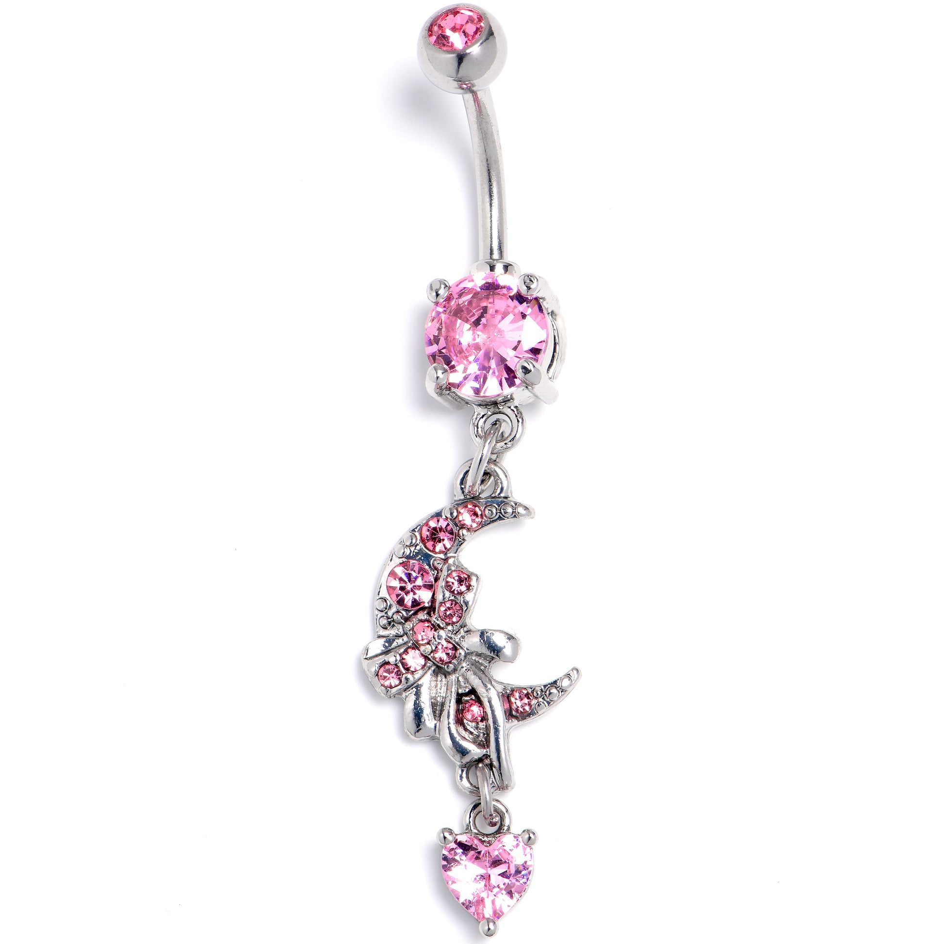 Pink CZ Gem Moon Bow Heart Dangle Belly Ring