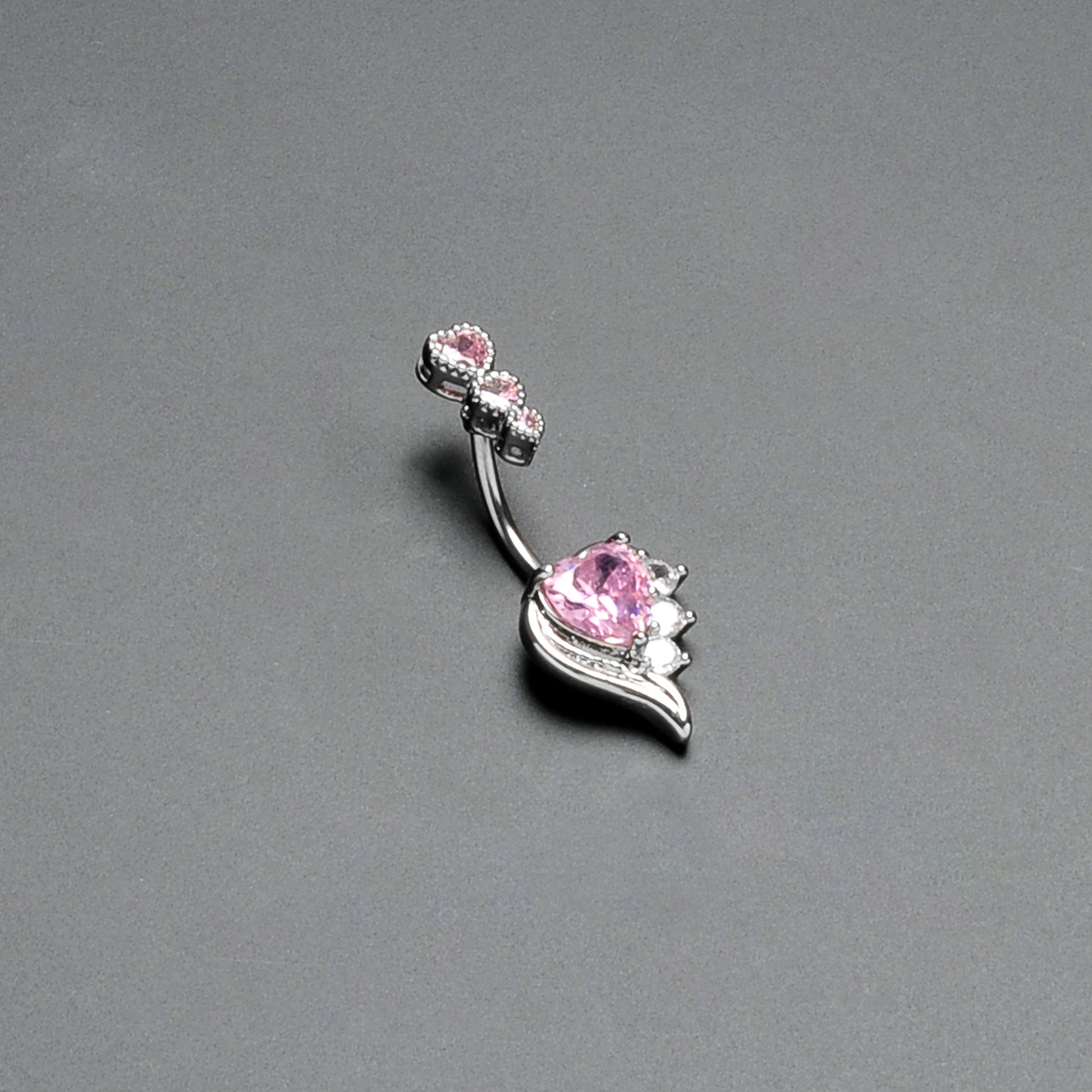 Pink CZ Gem Triple Drop Flare Heart Valentine Double Mount Belly Ring