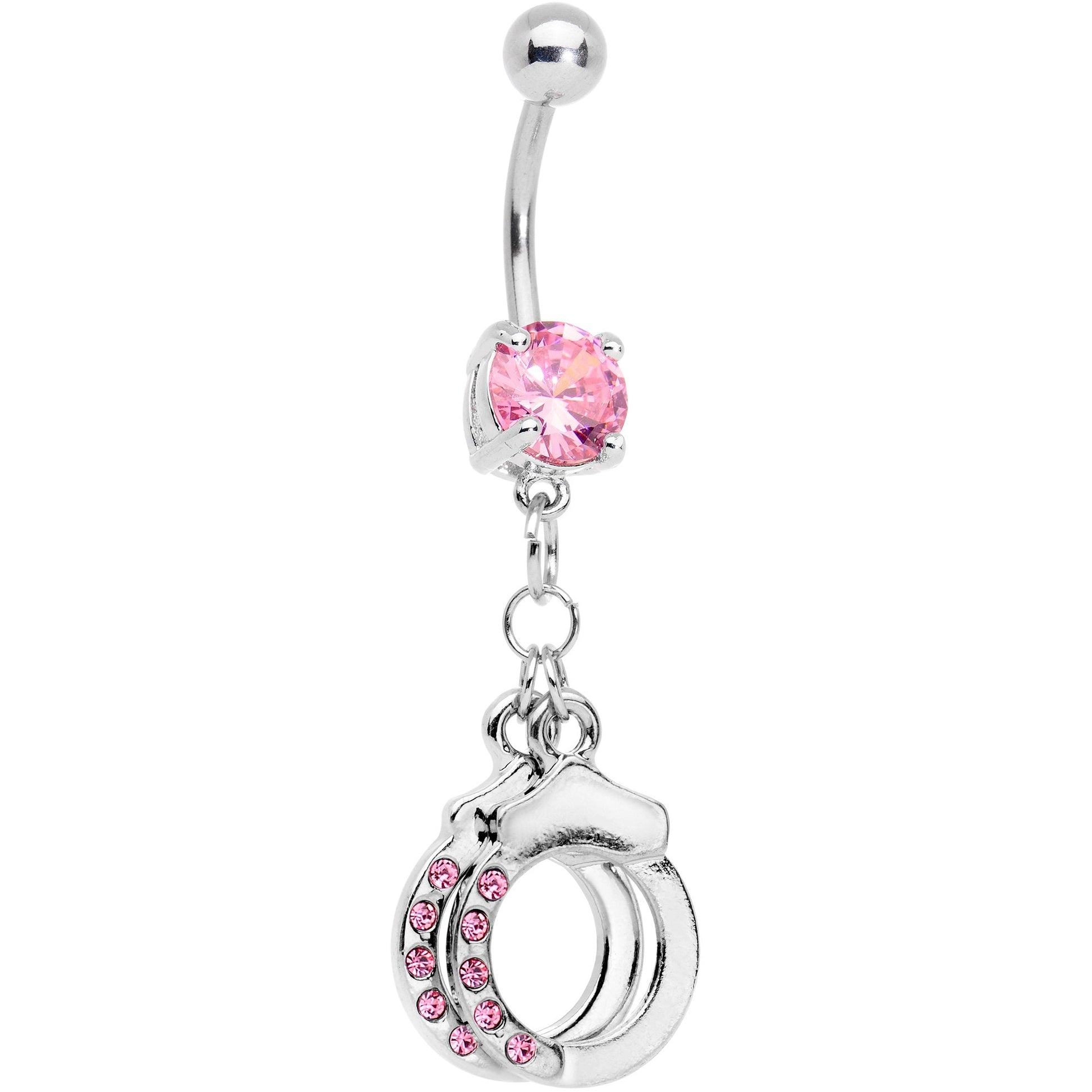Show off your wild side with this clear gem encrusted handcuff dangle belly ring. Two handcuff charms each decorated on one side by a handful of pink gems, are featured on this 14 gauge belly button piercing. The cuff charms are mounted on 7/16" in length 316L surgical grade stainless steel curved barbell complete with a pink gem bottom ball.