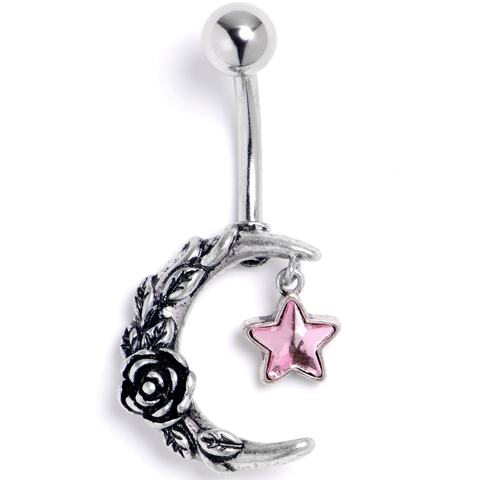 The moon rises every night but it is a star on this 14 gauge navel ring. It is made with a 3/8 inch 316L surgical grade stainless steel curved barbell with a 5mm top ball end. The bottom end features a moon charm heavily textured with a rose embellishment on one side. At the top of the crescent is a pink gem star dangle for a romantic feel. With all that moonlight and elegance, you're bound to fall in love with this lovely, lunar belly piercing jewelry.Specifications