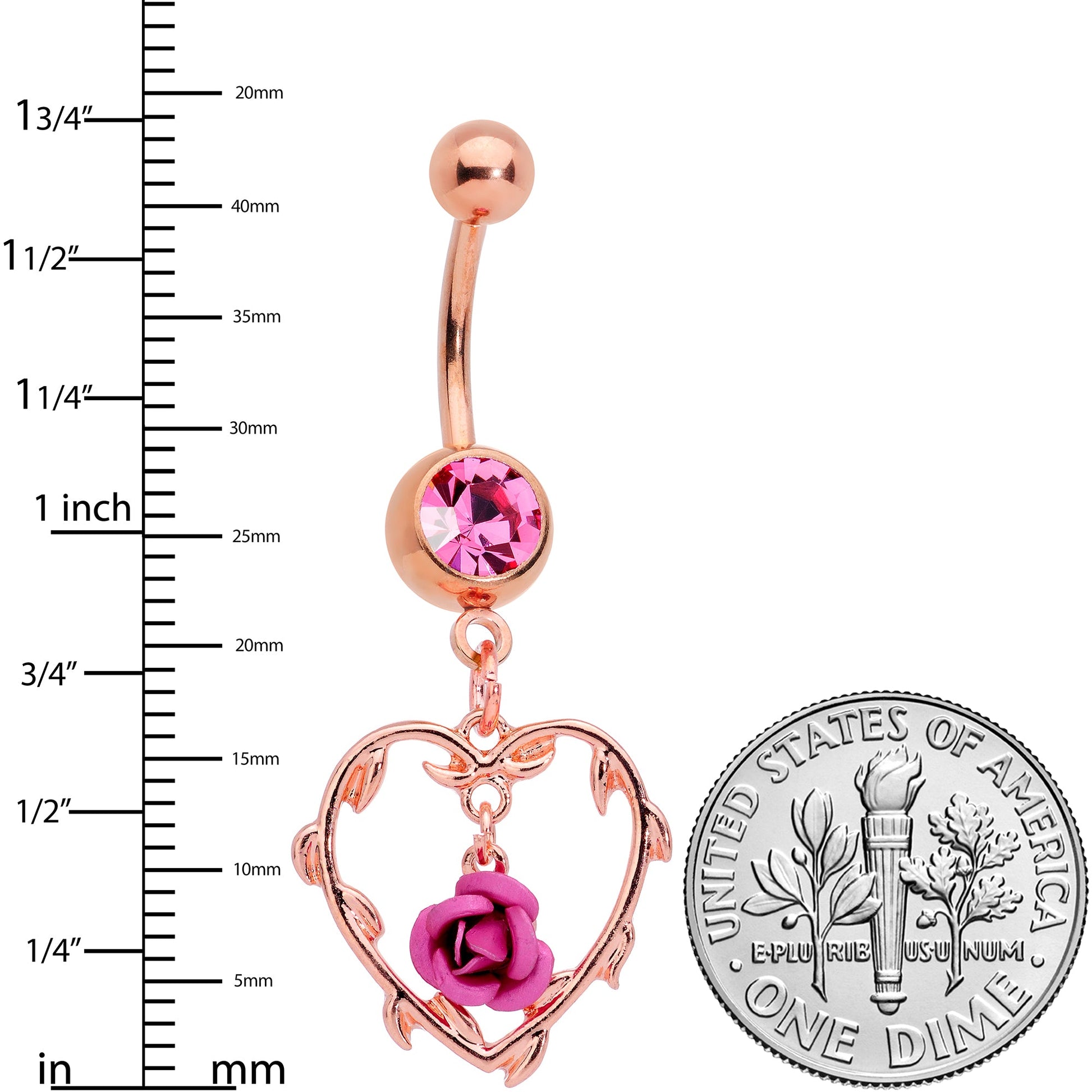 Love blooms like a rose garden with this 14 gauge navel ring! It's made with a 3/8" rose gold tone plated over 316L surgical grade stainless steel curved barbell with a 5mm top ball end. The bottom ball end is 8mm and set with a large pink gem. Dangling beneath is a heart-shaped charm, the heart composed of twining vines. Hanging at the center is a matching pink rose with multi dimensional details that add depth and style. Let your heart blossom with this beautiful floral belly button jewelry.Specifications