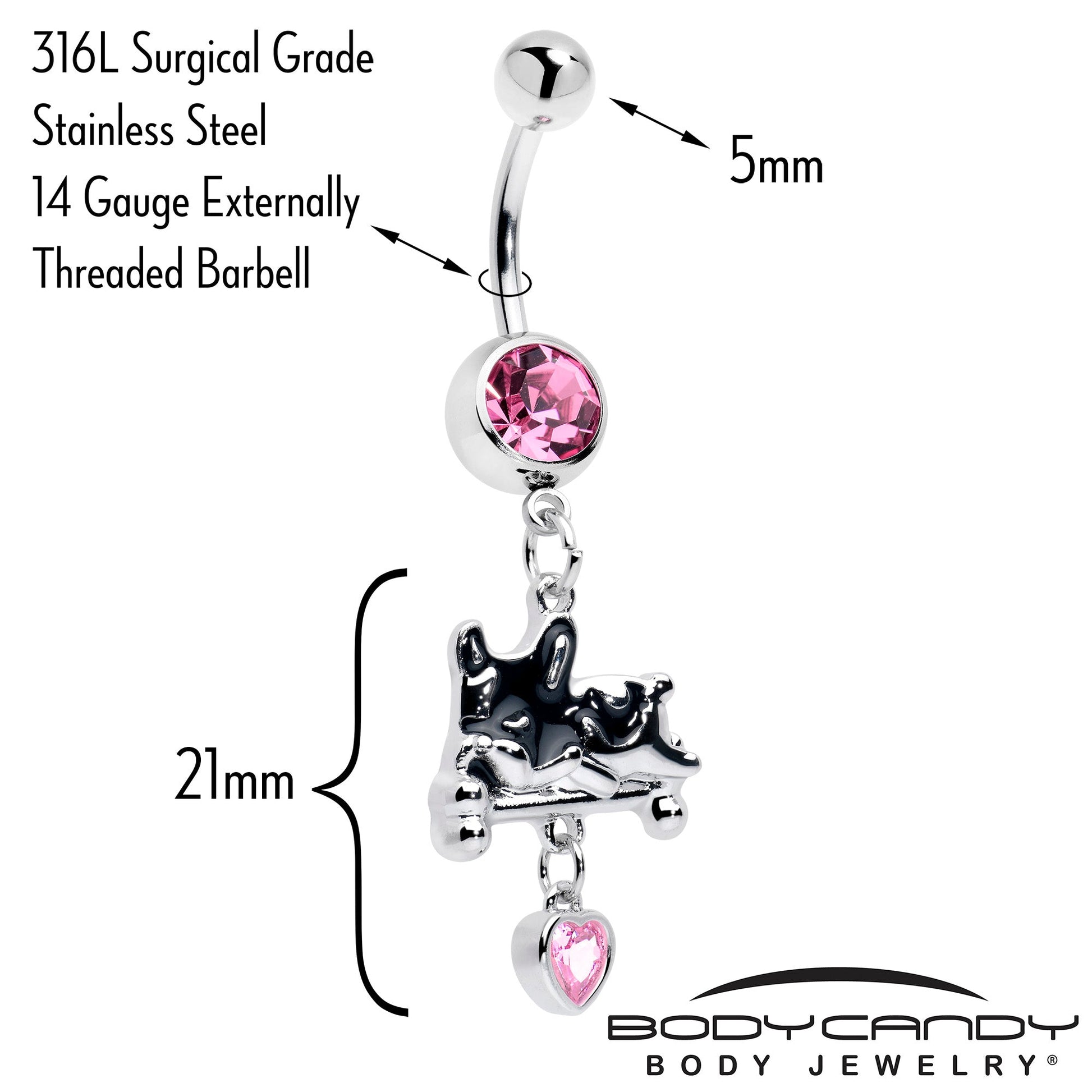 Get comfy and cozy while looking as cute as the dog on this 14 gauge navel ring. It's made with a 3/8 inch 316L surgical grade stainless steel curved barbell with a 5mm top ball end. The bottom ball end is 8mm and set with a large pink gem. Dangling beneath is a charm of a French Bulldog with graphic black and white colors, snoozing on a bed. Dangling beneath it is a pink gem heart so everyone knows how much you love these popular puppers. You'll be ready to sit and beg for this adorable French Bulldog belly piercing jewelry.Specifications