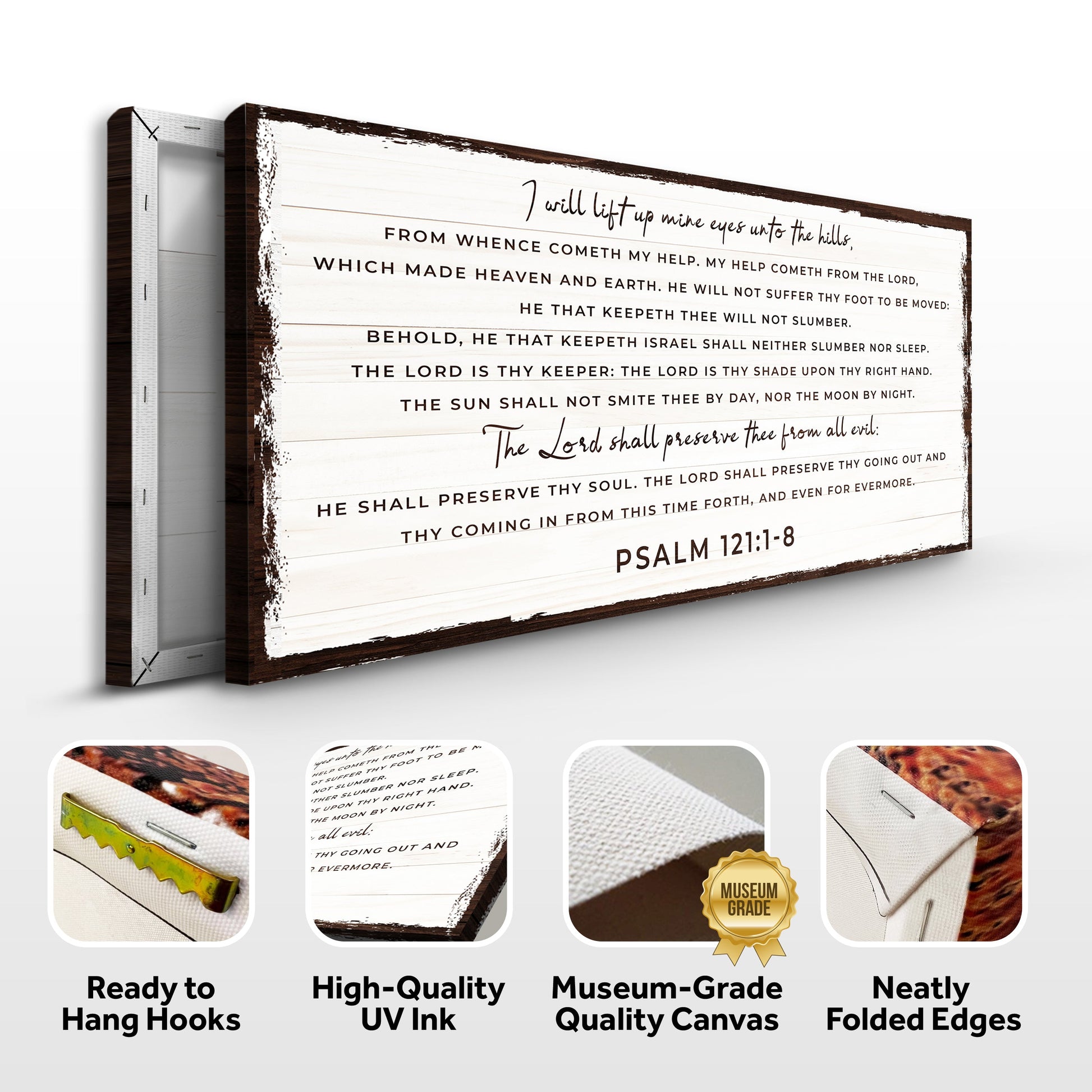 This Psalm 121:1-8 - My Help Comes From The Lord Sign is ideal for inspiring your home decor and making you feel better. This canvas print encourages the reader with a sense of comfort and safety while reading it. The Psalm represents a promise from God to protect us no matter our Fedex and downs, which is why we love to hang it in our home!