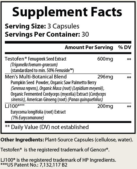 Testofen ® was also added to Pure Testosterone. Testofen ® is a patented specialized saponin glycoside extract from Fenugreek(Trigonella foenum-graecum seed) by Gencor™. Testofen® has been shown to significantly increase free testosterone in a 12 week trial at 600mg dose. This may be due to the inhibition of aromatase and 5α reductase, reducing the conversion of testosterone to estrogen and dihydrotestosterone, leaving more total testosterone. Free testosterone is the most important testosterone because it is the only usable testosterone in the body.