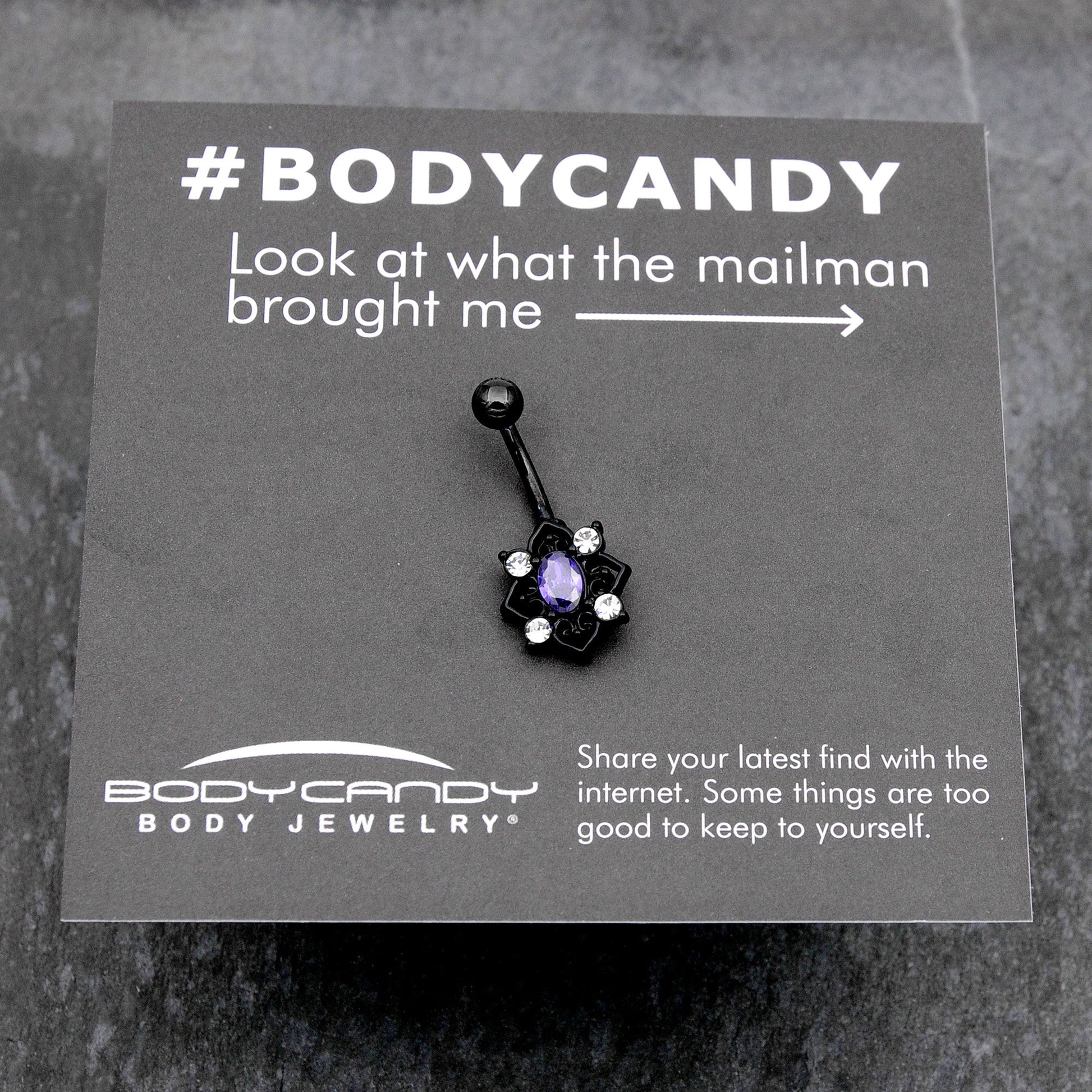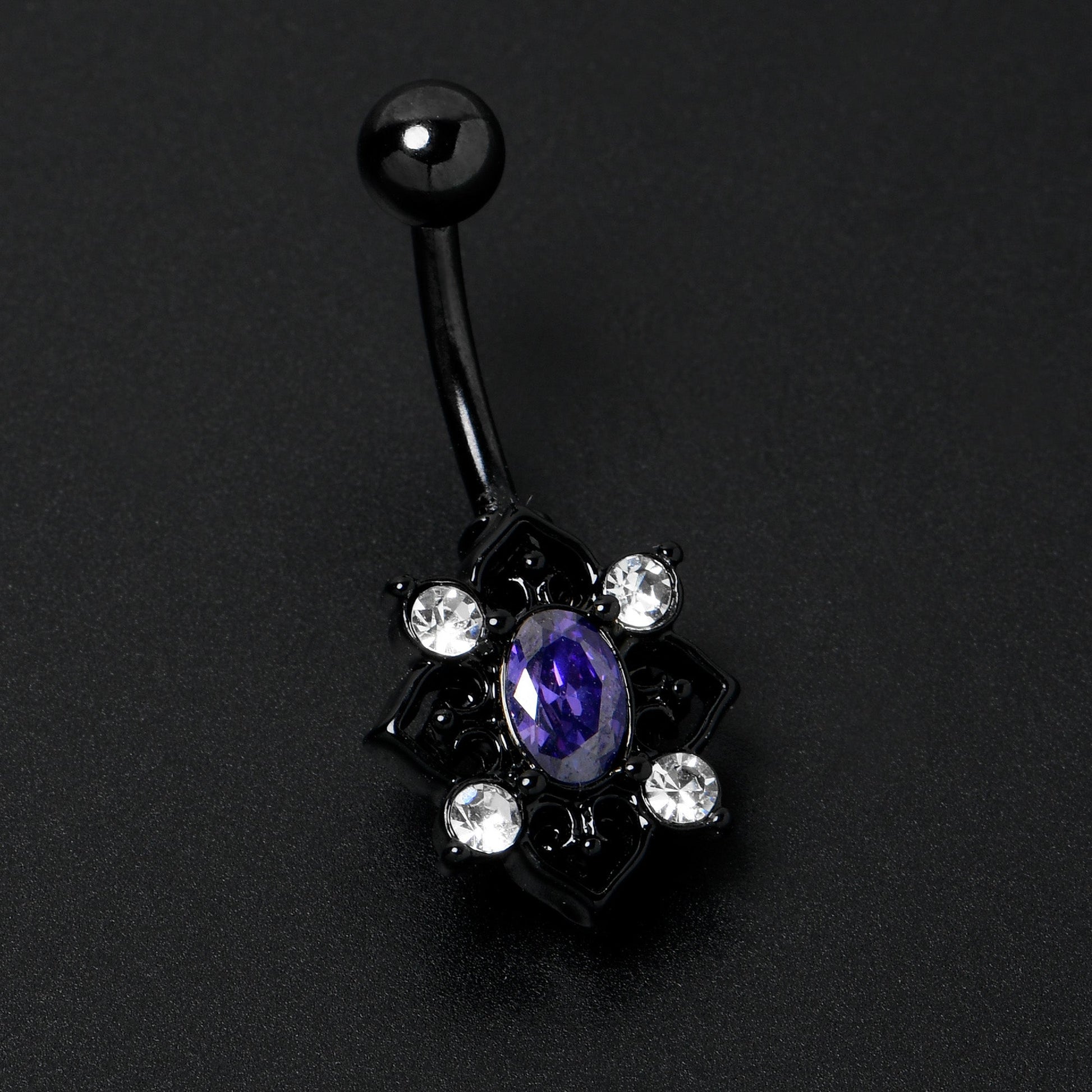 Fall in love with a goth new look, like on this 14 gauge navel ring. It is made with a 3/8 inch black PVD over 316L surgical grade stainless steel curved barbell with a 5mm top ball end. The bottom end features an oval charm, with a purple gem center. It is further embellished with scrollwork hearts, with a clear gem set between each one. Let your inner goth come out to play with this darkly divine belly piercing ring.Specifications
