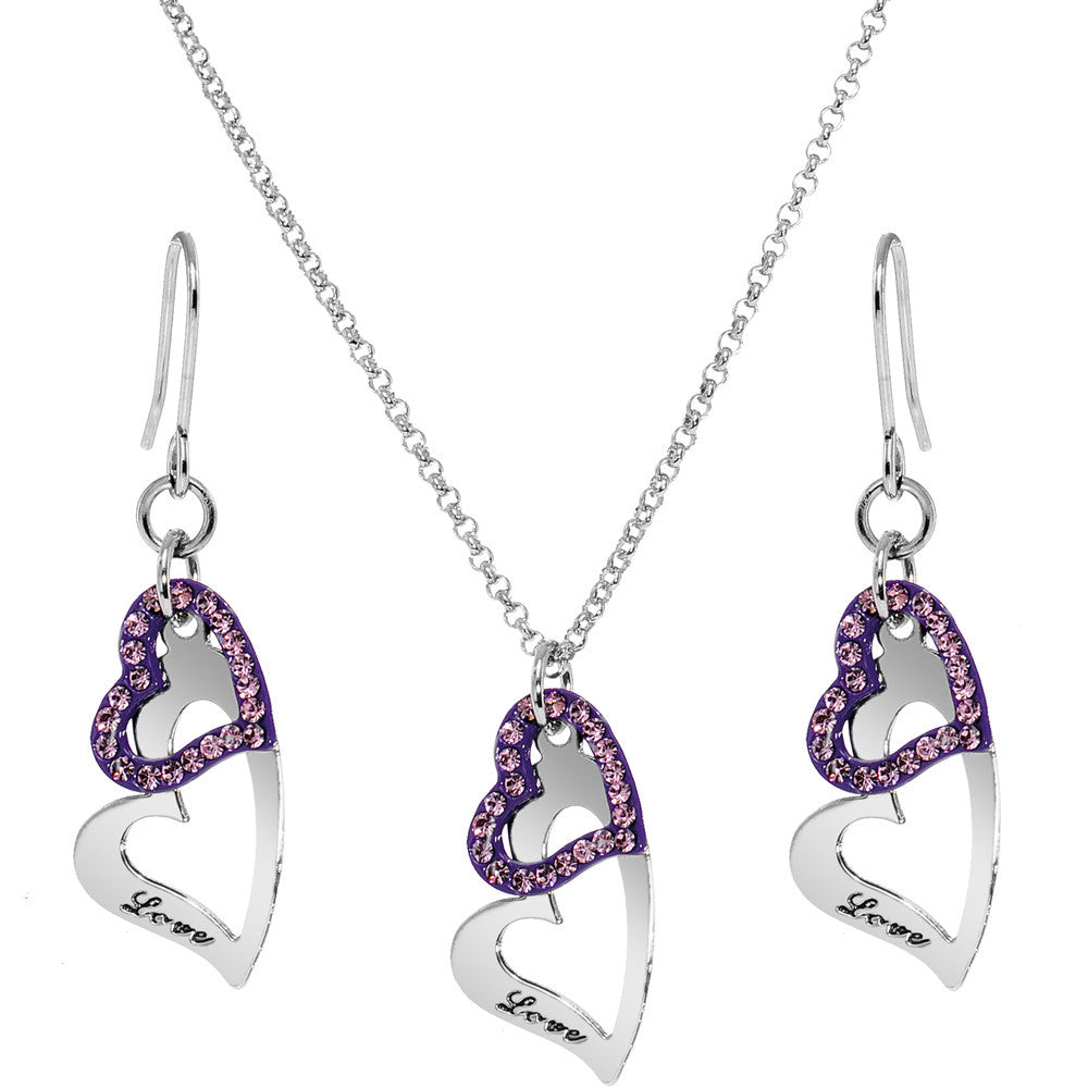Purple Duo Floating Love Inscribed Heart Necklace and Earring Set