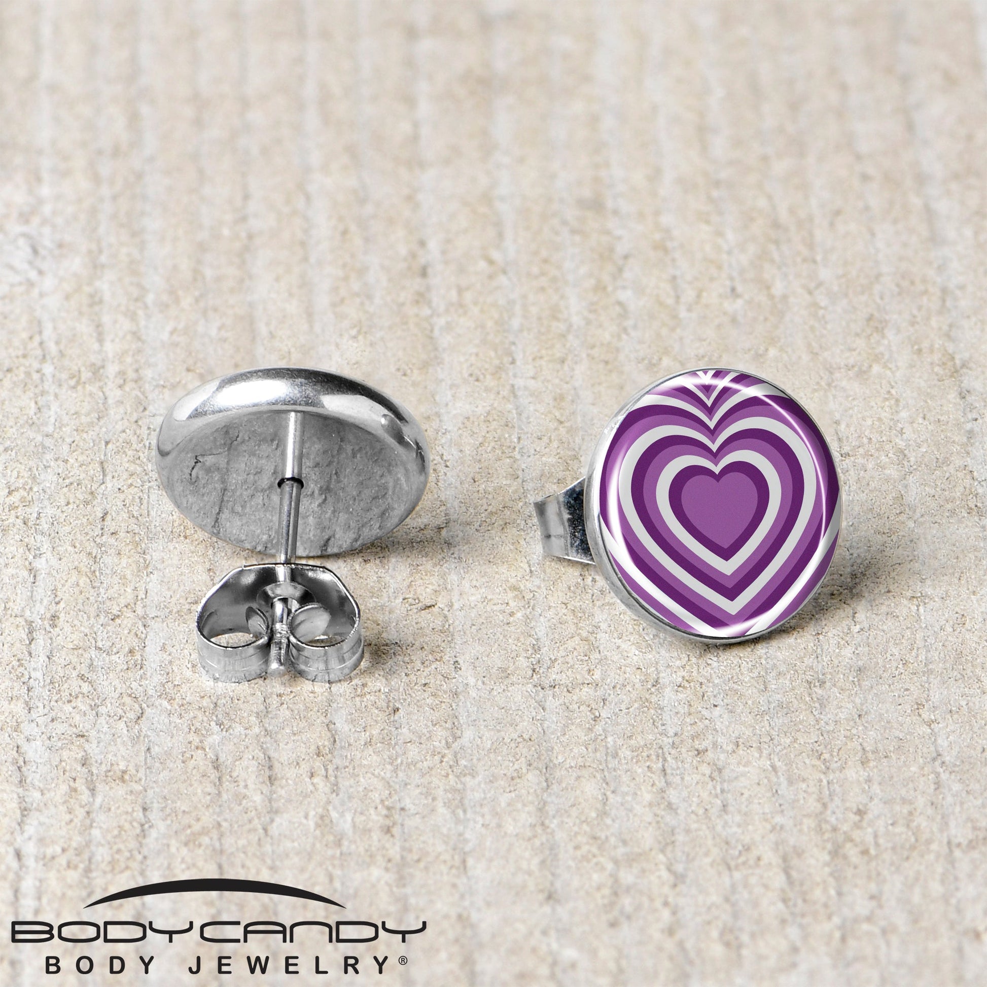 Fall in love with the trippy style of these stud earrings for pierced lobes. They're made with stainless steel straight posts with friction backs for a secure fit. Each one features a purple disc logo charm with a series of white and purple hearts that end with a purple heart at the center for a truly mindblowing look. You'll never want to stop looking at these trippy heart pierced earrings. Sold as a set of two.