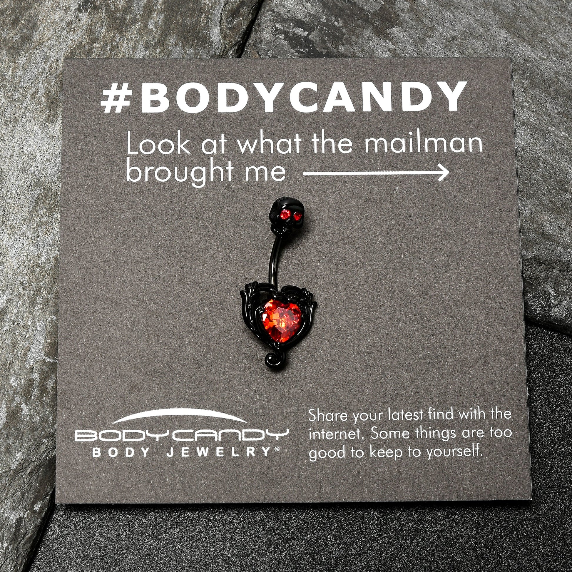Get an antique-inspired look that will steal your heart with this 14 gauge navel ring! It's made with a 3/8" black PVD over 316L surgical grade stainless steel curved barbell. The bottom end features a double heart charm, with the outer heart twining to give it a look that's both timeless and elegant. The inner heart is composed entirely of a single red cubic zirconia gem. The top end features a skull charm with red cubic zirconia gem eyes for an added touch of haunting glamour. Wear your heart on your sleeve and in your piercings with this gothic belly piercing ring!Specifications