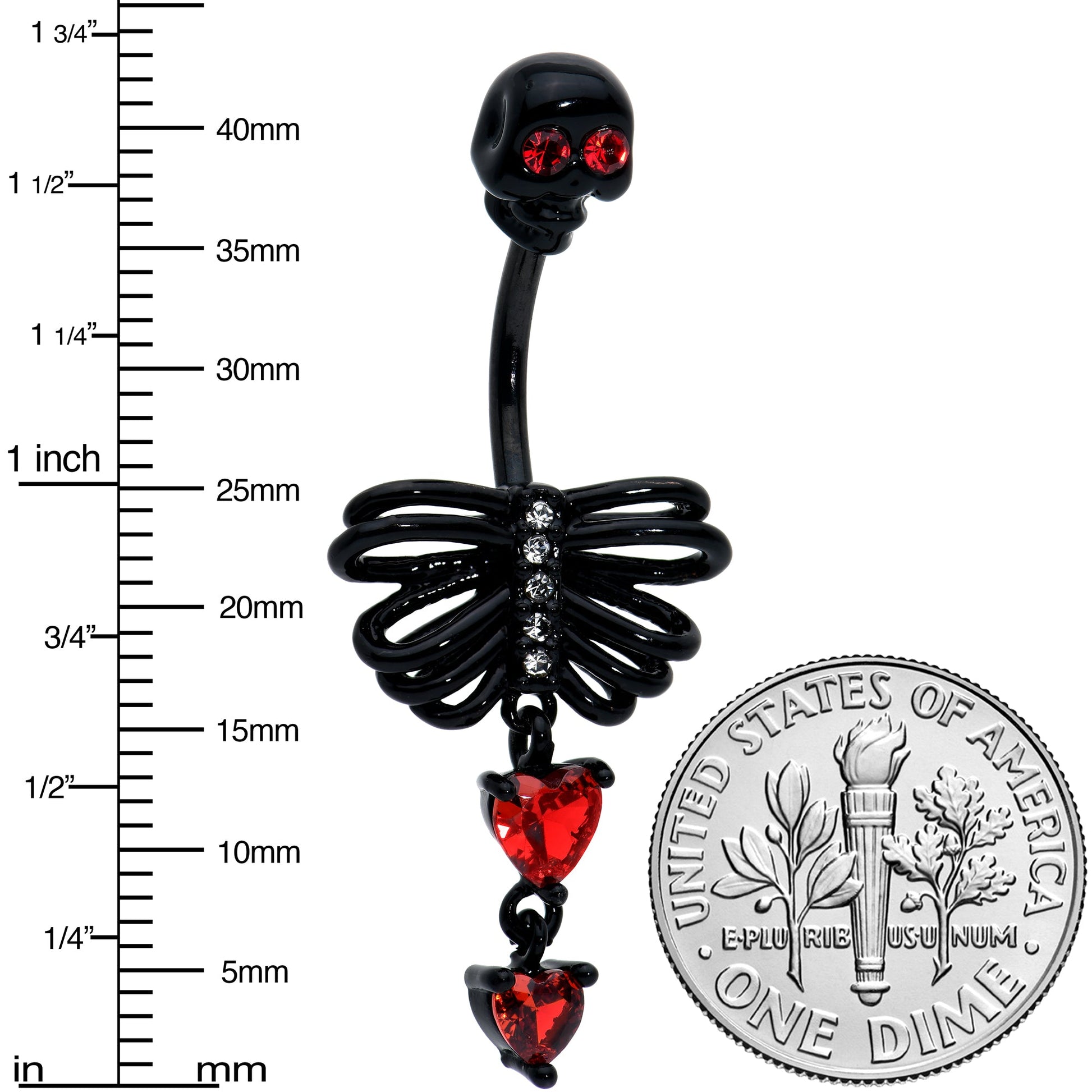 Add some ghoulish glamour to your look with this gothic 14 gauge navel ring! It's made with a 3/8" black PVD over 316L surgical grade stainless steel curved barbell. The top end features a black skull charm with red cubic zirconia gem eyes. The bottom end features a matching black ribcage charm with clear cubic zirconia gems going down the sternum. Dangling beneath are a pair of red cubic zirconia gem hearts for a darkly romantic touch. You'll rule the night when you're rocking this gorgeously gothic belly piercing ring!Specifications