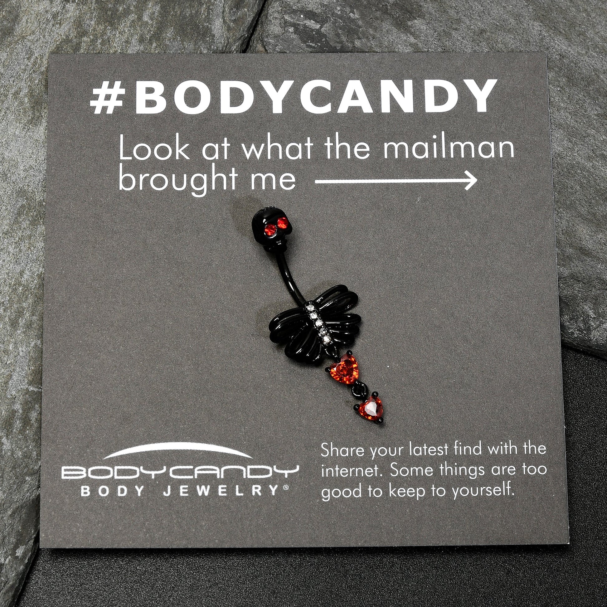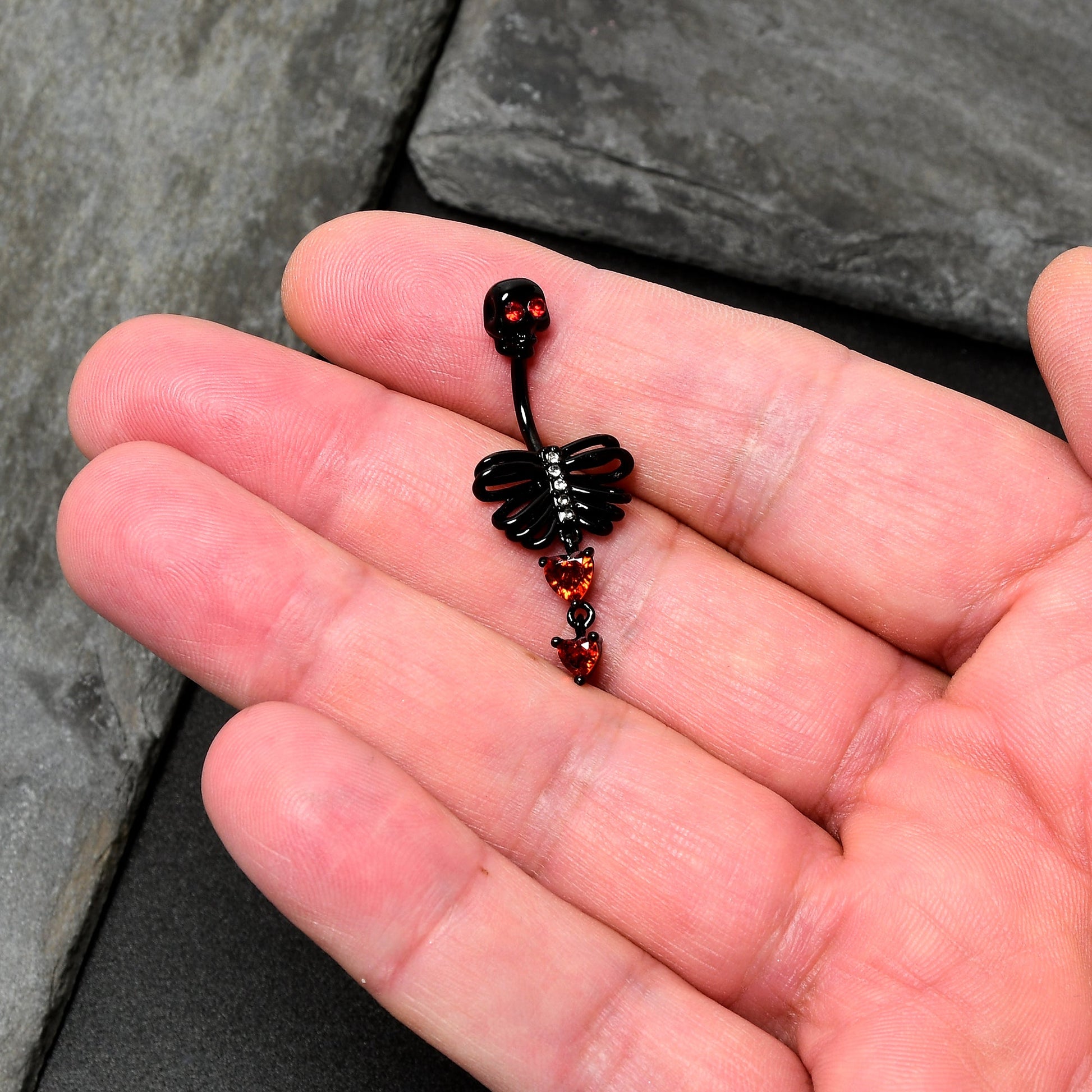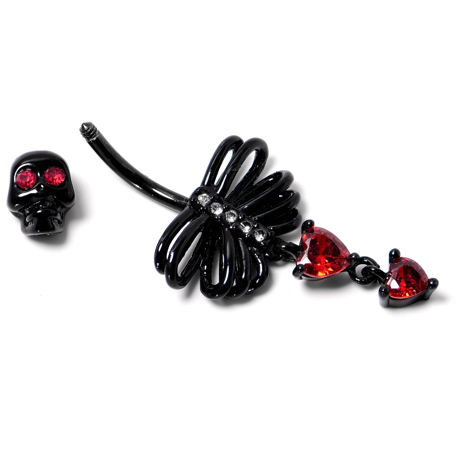Red CZ Gem Black Skeleton Hearts Gothic Dangle Belly Ring