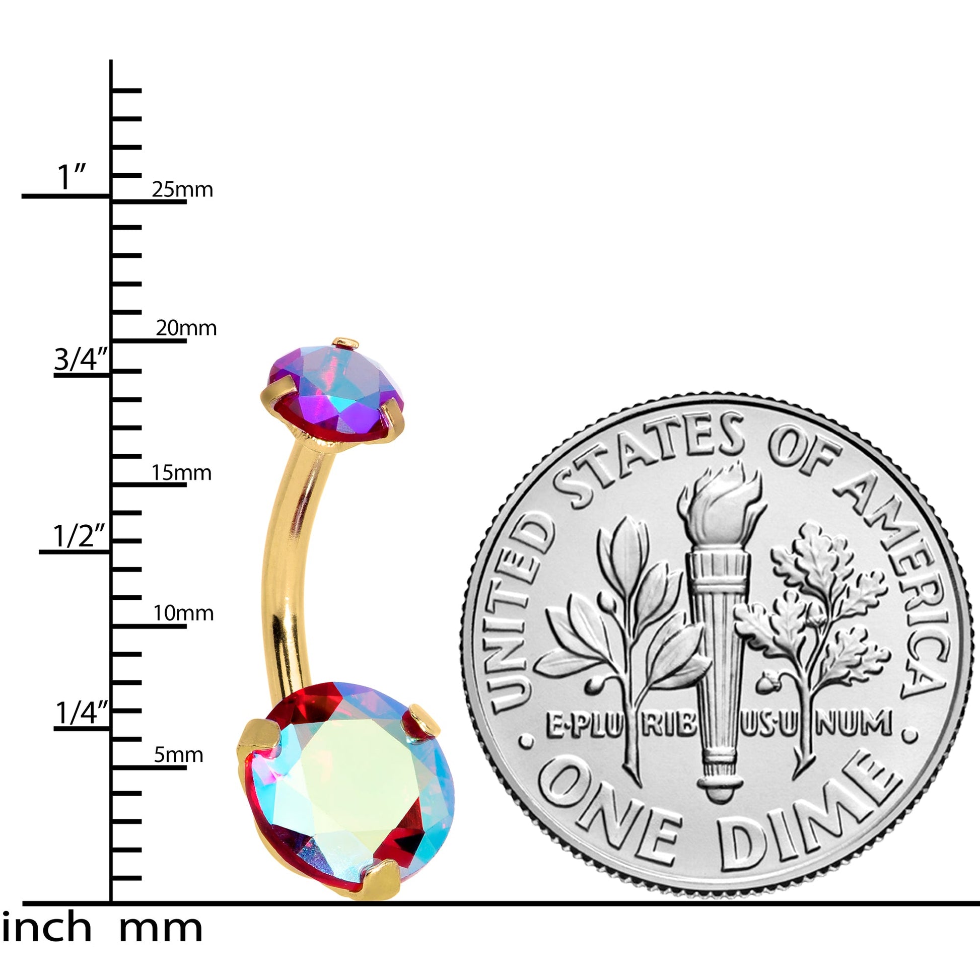 Double the color, double the glamour with this 14 gauge navel ring! It's made with a 3/8" gold tone PVD over 316L surgical grade stainless steel curved barbell. The top end is a 5mm red cubic zirconia gem. The bottom end is a matching 8mm red cubic zirconia gem and it's internally threaded for comfortable insertion and removal. The overall look is one of uncomplicated elegance that's both traditional and trendy. If you want it all in one neat package, you want this classy, colorful belly button jewelry!Specifications