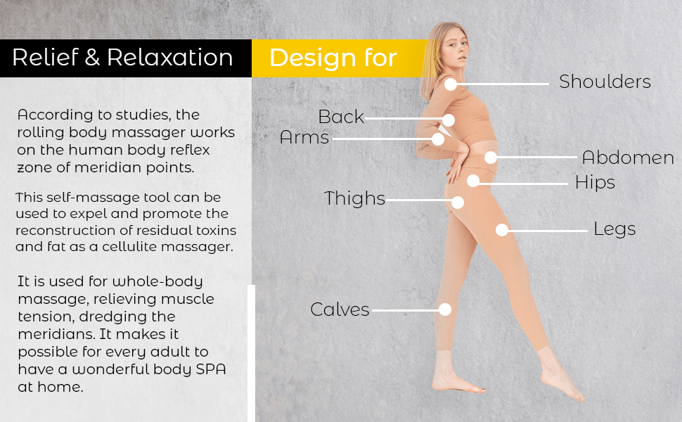 - MULTIFUNCTIONAL: BeNat's body massager, provides amazing relief and relaxation. According to studies, it works on the human body reflex zone of meridian points. This self-massage tool can be used to expel and promote the reconstruction of residual toxins and fat as a cellulite massager. Designed for shoulders, arms, back, abdomen, legs, calves, thighs, hips, waist, or muscle tension.