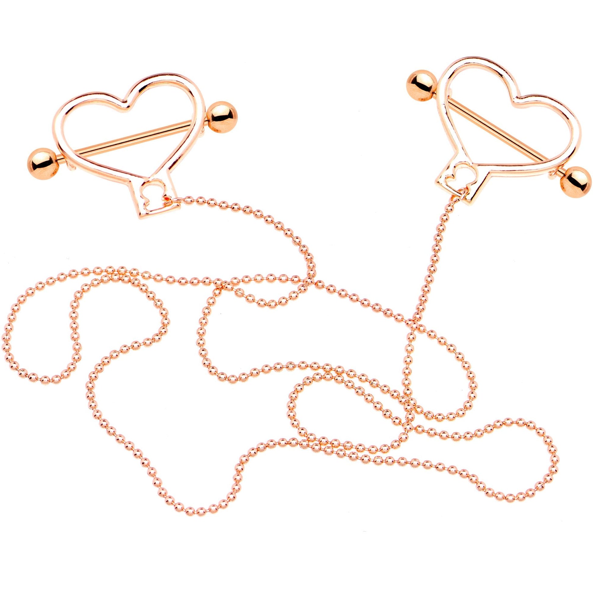 It's like a necklace for your breasts! This unique 14 gauge nipple chain jewelry is the perfect piercing to add to your body jewelry collection. This nipple ring chain features a pair of rose gold tone heart shaped nipple shields connected by a bead chain. With 1" straight barbells made from rose gold tone anodized over 316L surgical grade stainless steel, this 19" length nipple chain will really give you something to show off this Valentine's Day.
