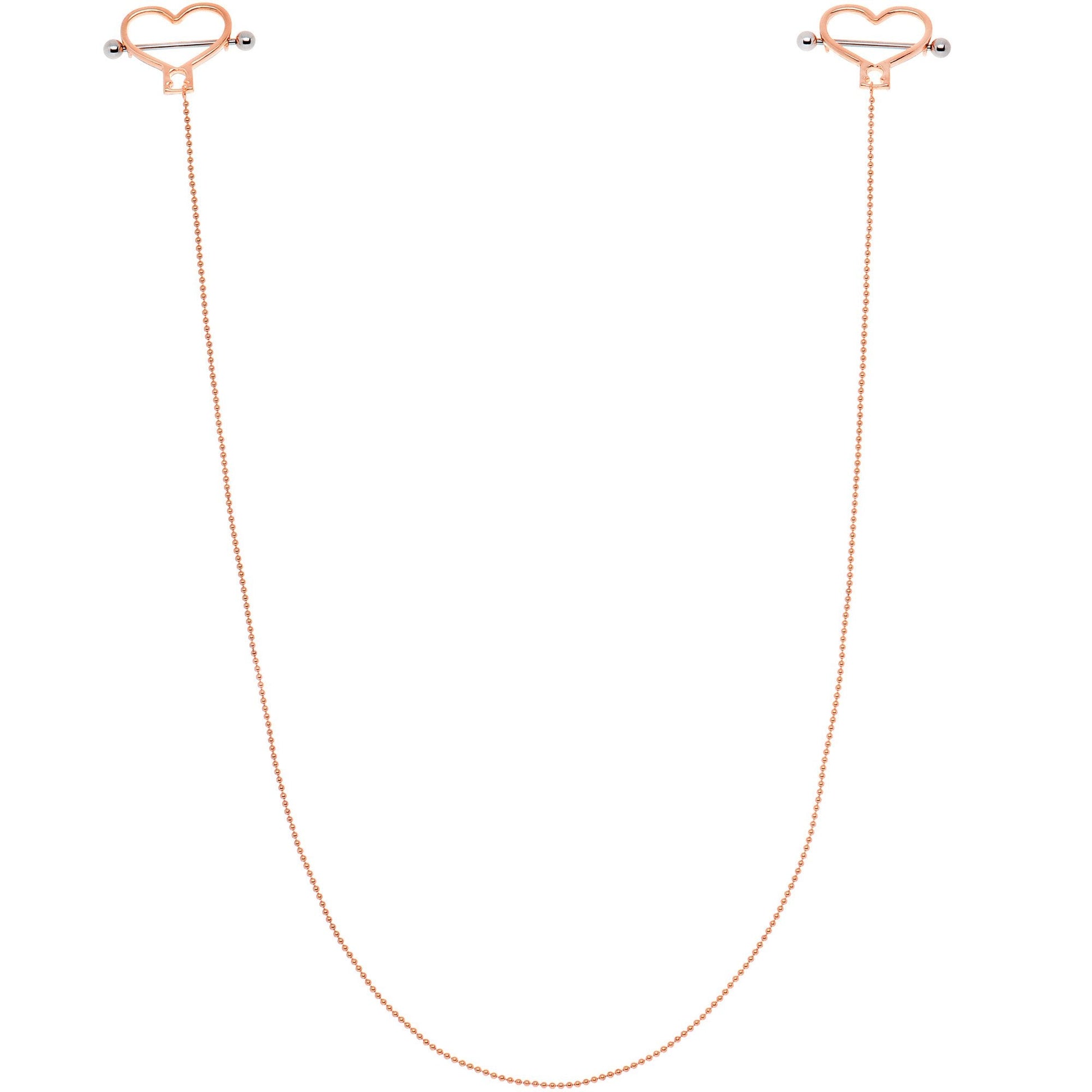 It's like a necklace for your breasts! This unique 14 gauge nipple chain jewelry is the perfect piercing to add to your body jewelry collection. This nipple ring chain features a pair of rose gold tone heart shaped nipple shields connected by a bead chain. With 1" straight barbells made from durable 316L surgical grade stainless steel, this 19" length nipple chain will really give you something to show off this Valentine's Day.
