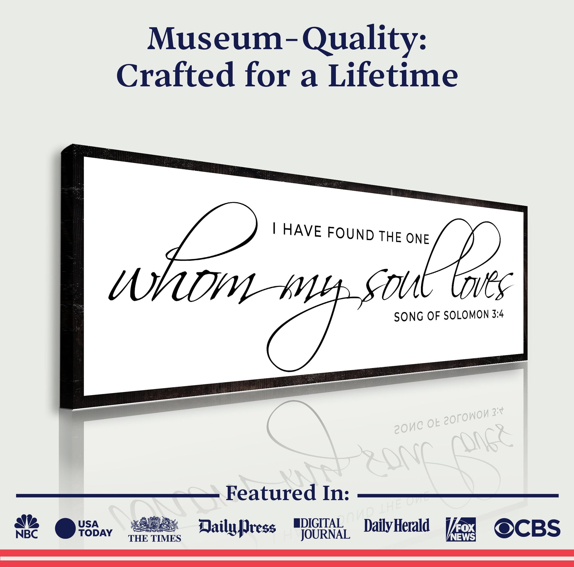 The Song of Solomon 3:4 - I Have Found the One wall art is made of a thick premium canvas, and UV-resistant ink is used to print the graphics. The Song of Solomon 3:4 - I Have Found the One canvas wall art is perfect for giving your house or room a poetic ambiance.