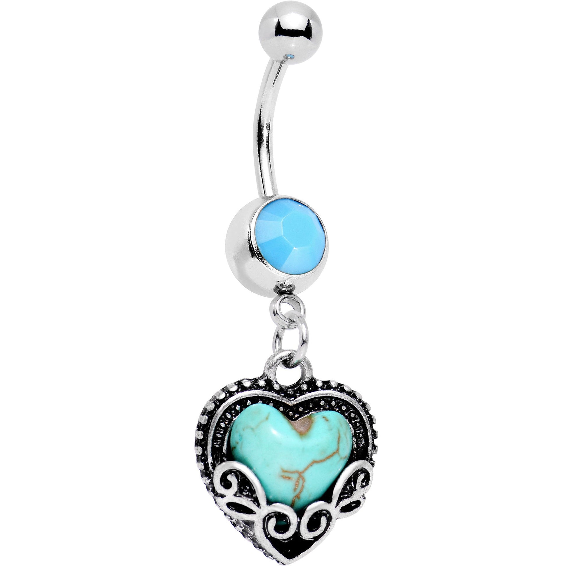 Discover the mysteries of the southwest with this 14 gauge ancient heart dangle navel piercing. Accented with a southwestern style faux turquoise, the heart drop dangle is framed by an ornate design which embraces the heart. The 316L surgical grade stainless steel curved barbell is 3/8" in length.