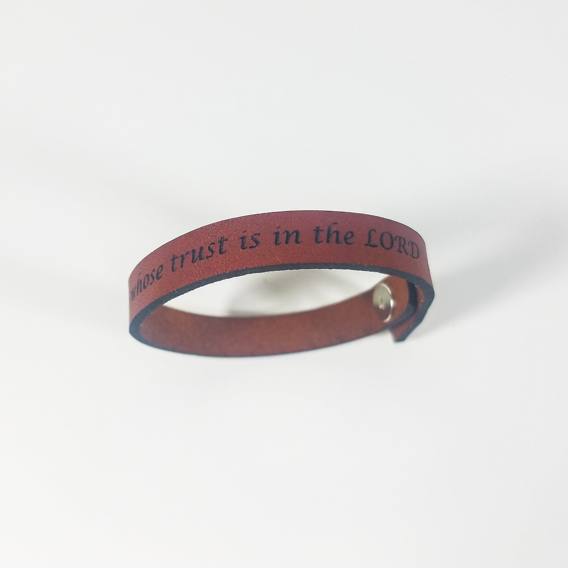 Our spiritual quote bracelets are laser etched on vege-tanned genuine leather. Bracelets include the chapter reference (reference may be abbreviated).