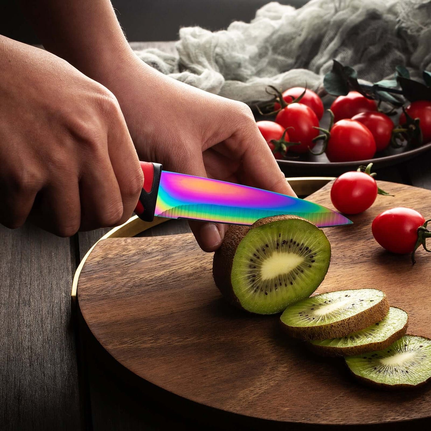 ✨ FOOD GRADE STAINLESS STEEL : Experience exceptional durability and performance with our food grade stainless steel knives. Crafted from superior quality stainless steel, each blade is finely sharpened and plated with non-stick titanium for a colorful, iridescent finish that adds a touch of style to your kitchen.