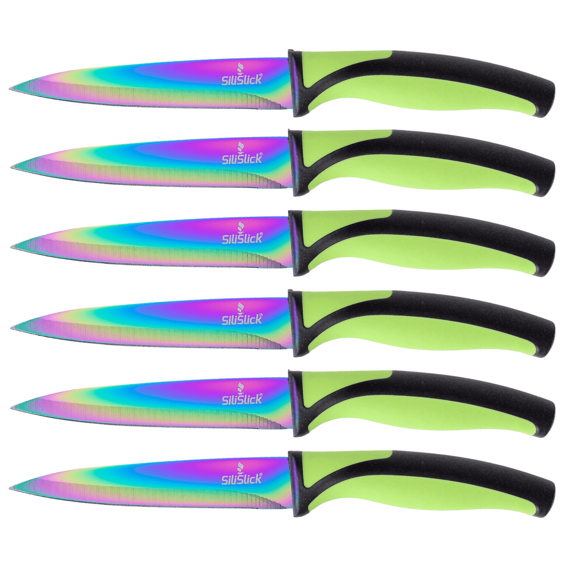 Steak Knife Set 6 Rainbow Titanium Coated Blades & Green Handles
