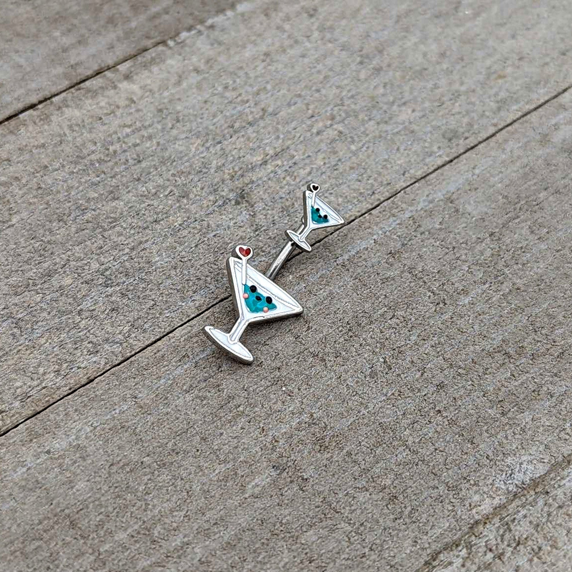 Bottoms up for style, with this 14 gauge navel ring! It's made with a 10mm durable 316L surgical grade stainless steel curved barbell. Each of the ends features a martini glass charm, with blue embellishment and a heart-ended swizzle stick. They also features faces on the glasses for added sweet style. Drink in the compliments when you're rocking this cocktail-themed belly piercing rings!Specifications