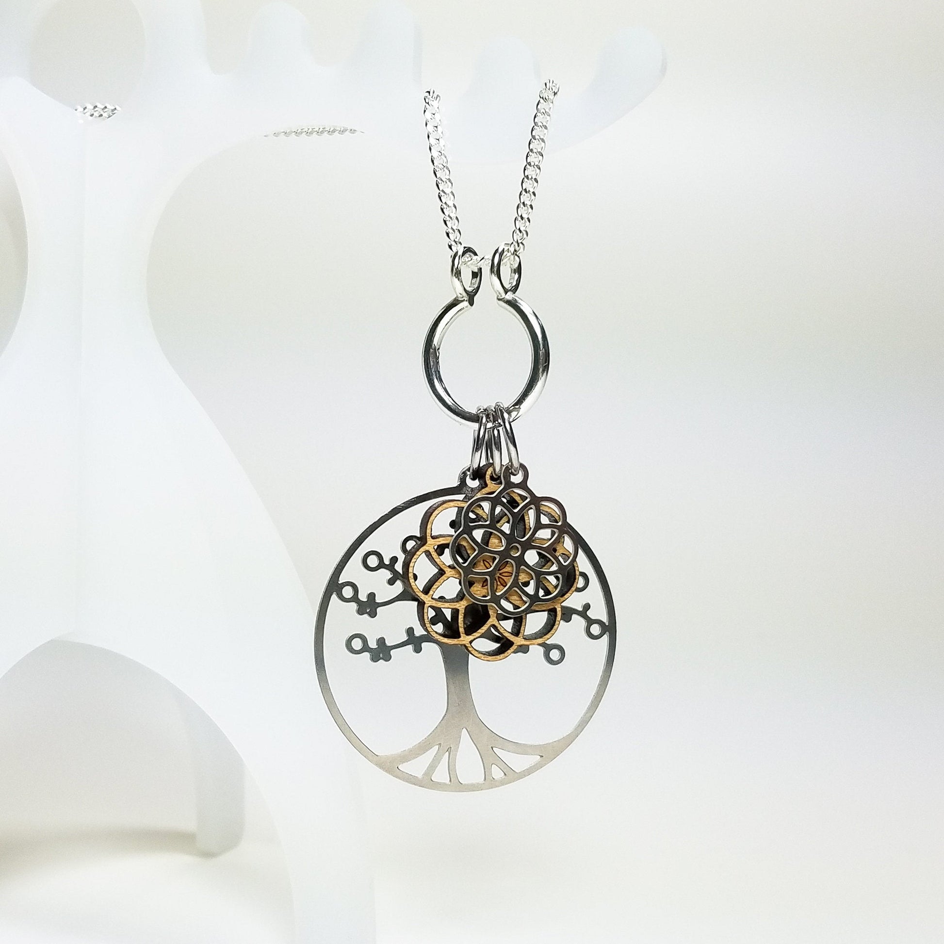 Tree of Life Charm Necklace. Stainless steel and cherry wood charms, 30" long silver-plated chain. Sterling silver charm keeper - its open end lets you add more charms if desired. From our Natural Collection - organic designs inspired by flora and fauna. Our mission with our Jewelry Collection is to offer a unique and fresh line of jewelry featuring alternative materials (leather, wood, stainless steel) and elegant, clean design.