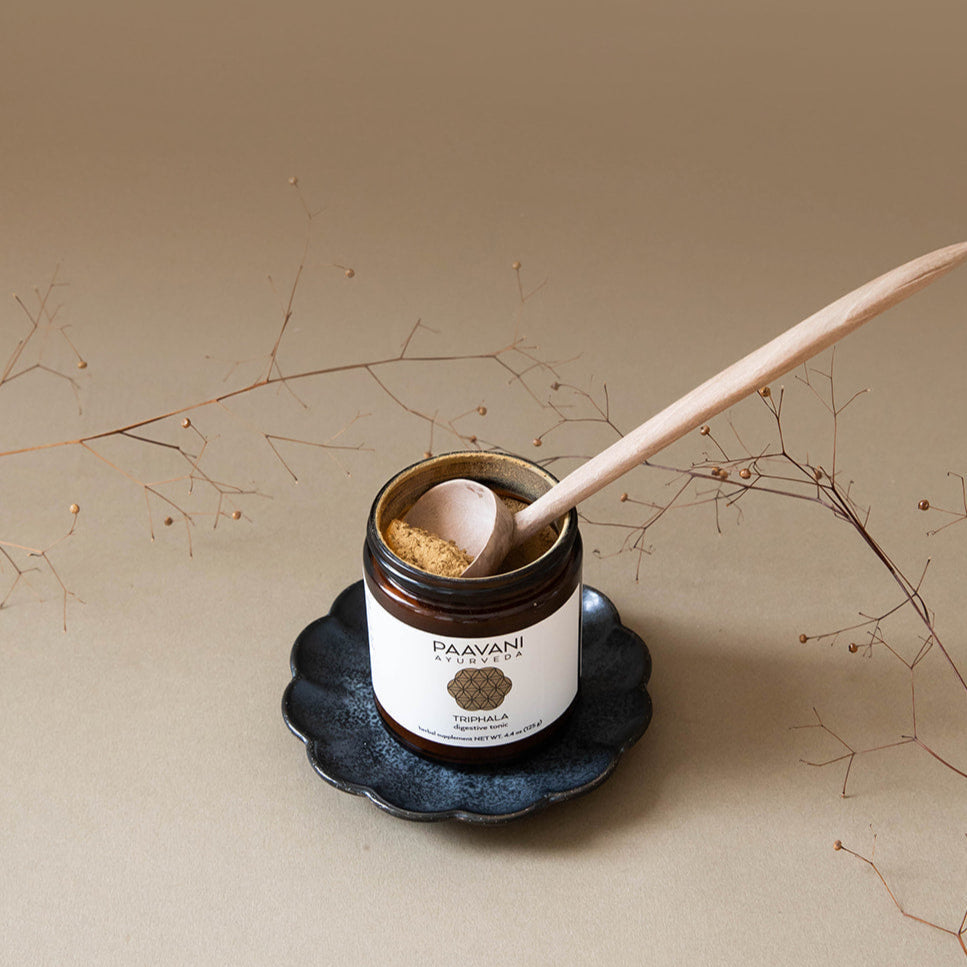 Triphala is a classical Ayurvedic formulation made from three revered Indian superfruits: Haritaki, Amalaki & Bibhitaki . Together, they work to aid digestion, support the assimilation of nutrients, promote regular elimination & tone the colon.