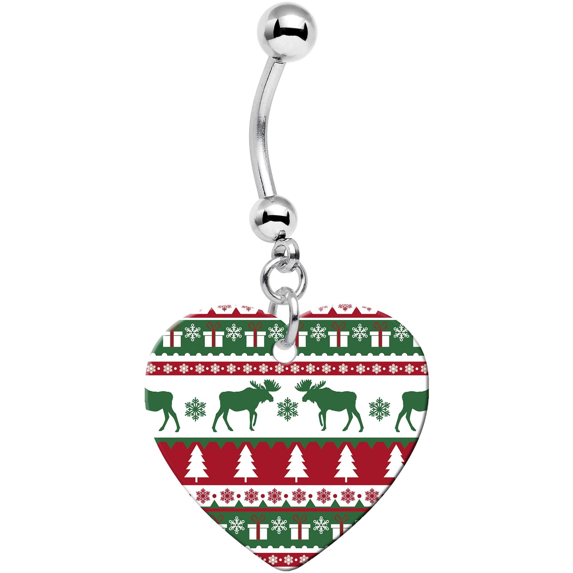 Ugly Christmas Sweater Heart Dangle Belly RingGet decked out from head to toe in Christmas spirit when you wear this 14 gauge festive holiday belly button ring! Made with a 7/16" durable 316L surgical grade stainless steel curved barbell, this holiday navel ring features a red, green, and white ugly Christmas sweater heart charm. This ugly Christmas sweater navel jewelry makes a perfect seasonal gift for someone special to you.