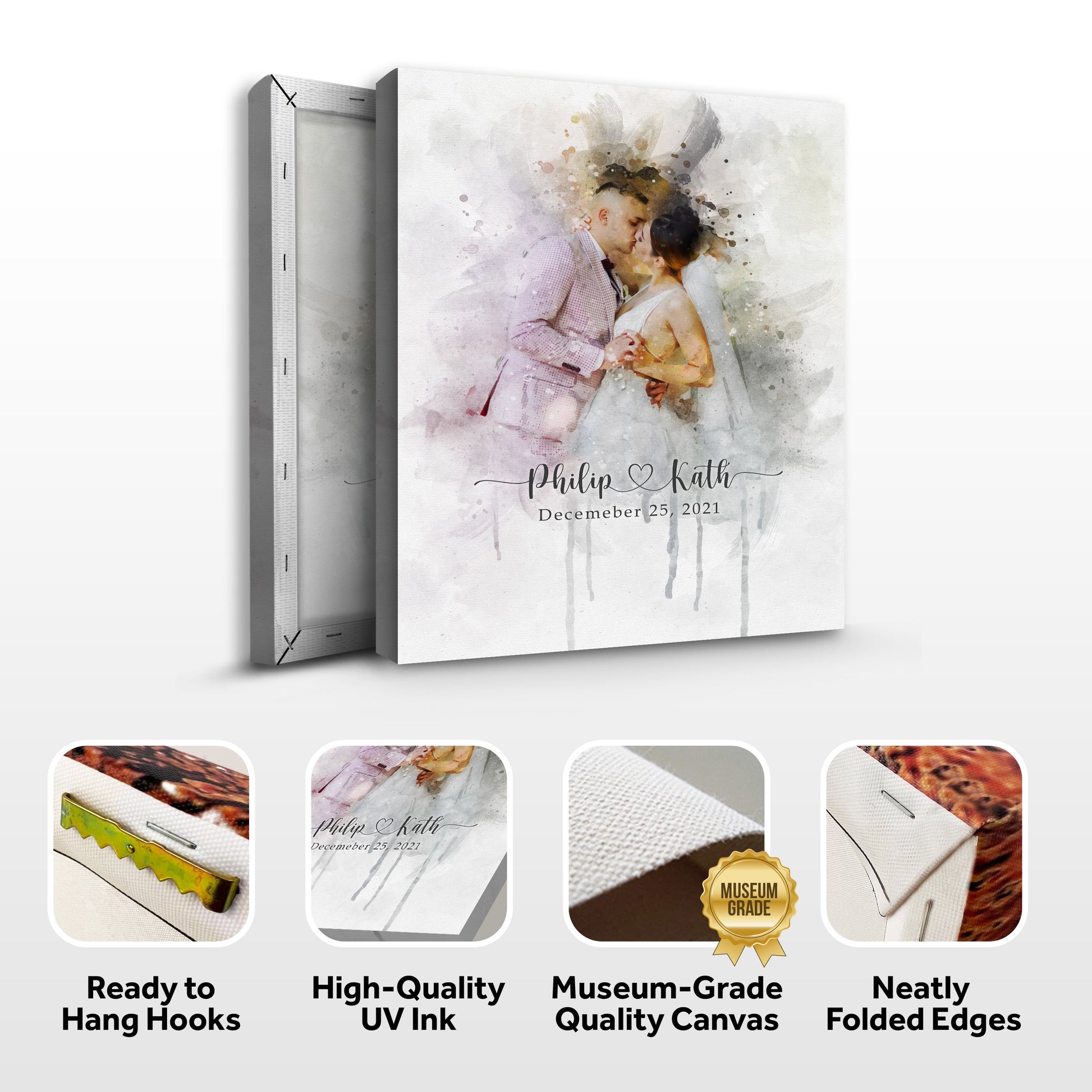 Because it is composed of enduring materials that will never go out of style, this premium Custom Wedding Portrait Watercolor canvas print will endure the test of time. With this personalized wedding portrait watercolor wall art, which is the ideal size for any room in the house, you can show your significant other how much you care for them. There is no need to settle when it comes to home décor because we have produced this wall art in three distinct sizes.