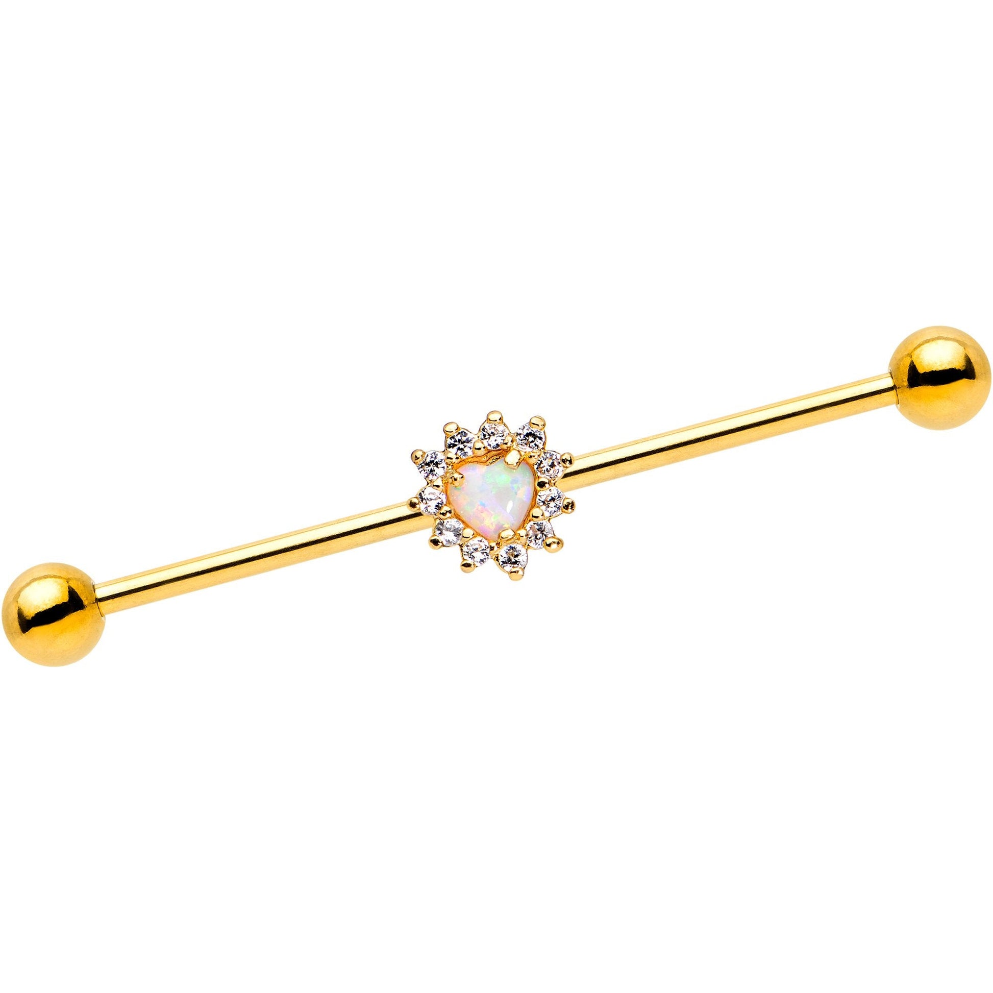 White Faux Opal Clear CZ Gem Heart Gold PVD Industrial Barbell 38mm