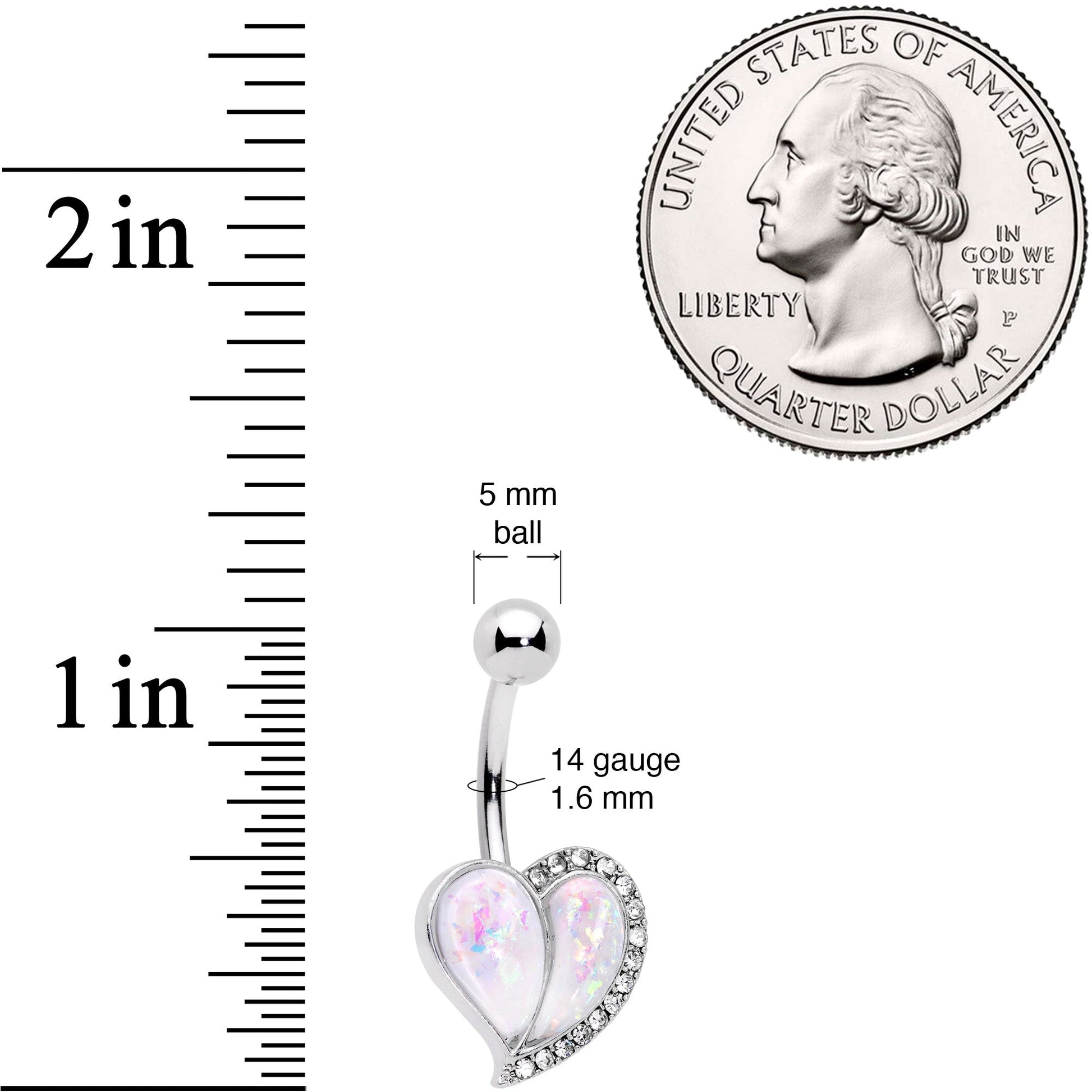 This 14 gauge navel jewelry is sure to make your heart beat a bit faster! It's made with a 3/8" durable 316L surgical grade stainless steel curved barbell with a 5mm top ball end. The bottom end features a white faux opal heart charm with a row of clear gems down one side. The heart is divided into two sections, making it resemble the shape of a ripe juicy peach. So whether you think hearts are heavenly or have a fondness for fruit, you'll think this stylish belly button ring is just...peachy!Specifications