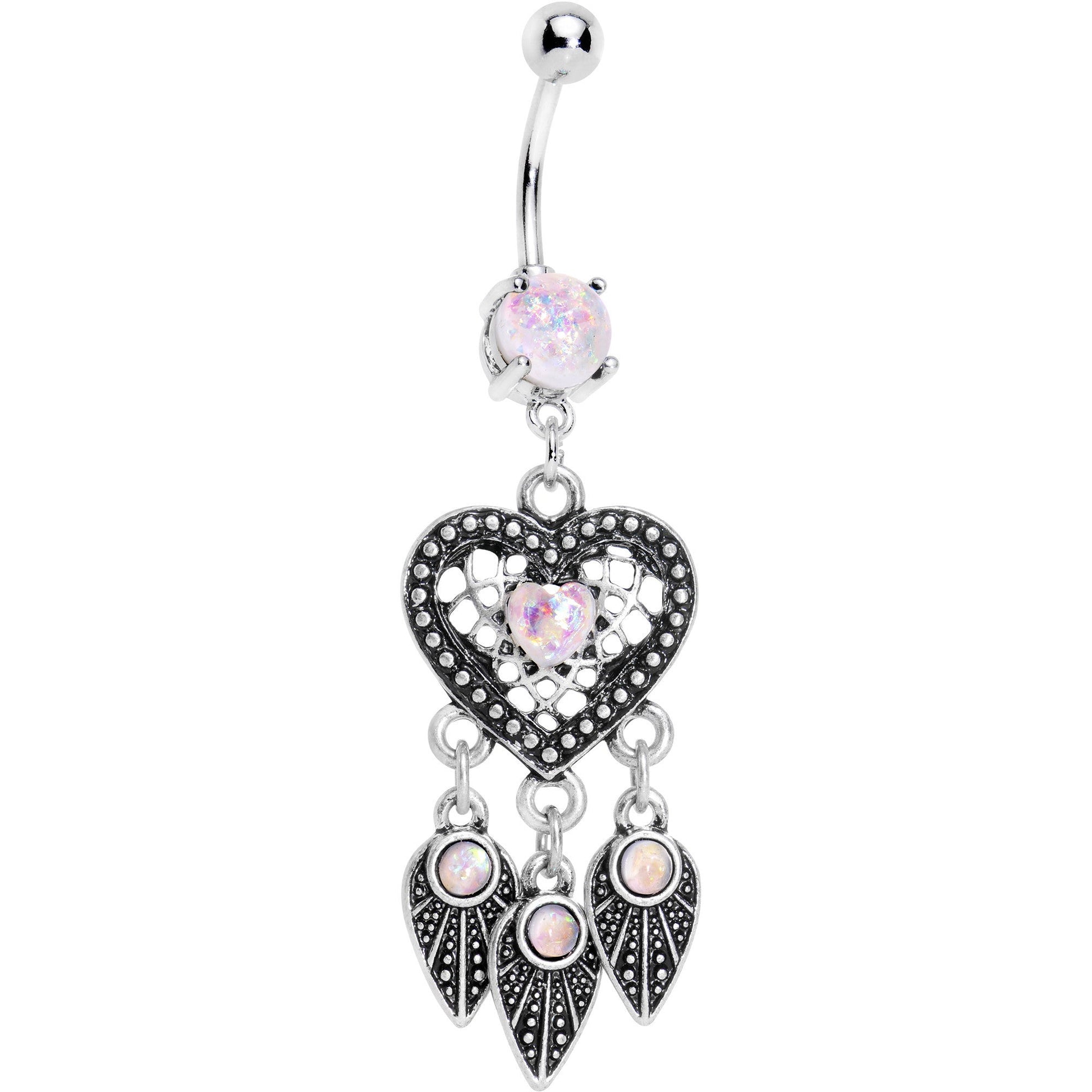 Dare to dream of love whether Valentine's Day is near or a year away whenever you wear this pretty 14 gauge belly button ring. Made with a 7/16" durable 316L surgical grade stainless steel curved barbell, this navel piercing features a bottom white faux opal as well as a dreamcatcher style heart charm set with a single heart-shaped white faux opal center as well as leaf-like detailed dangles set with white faux opals.