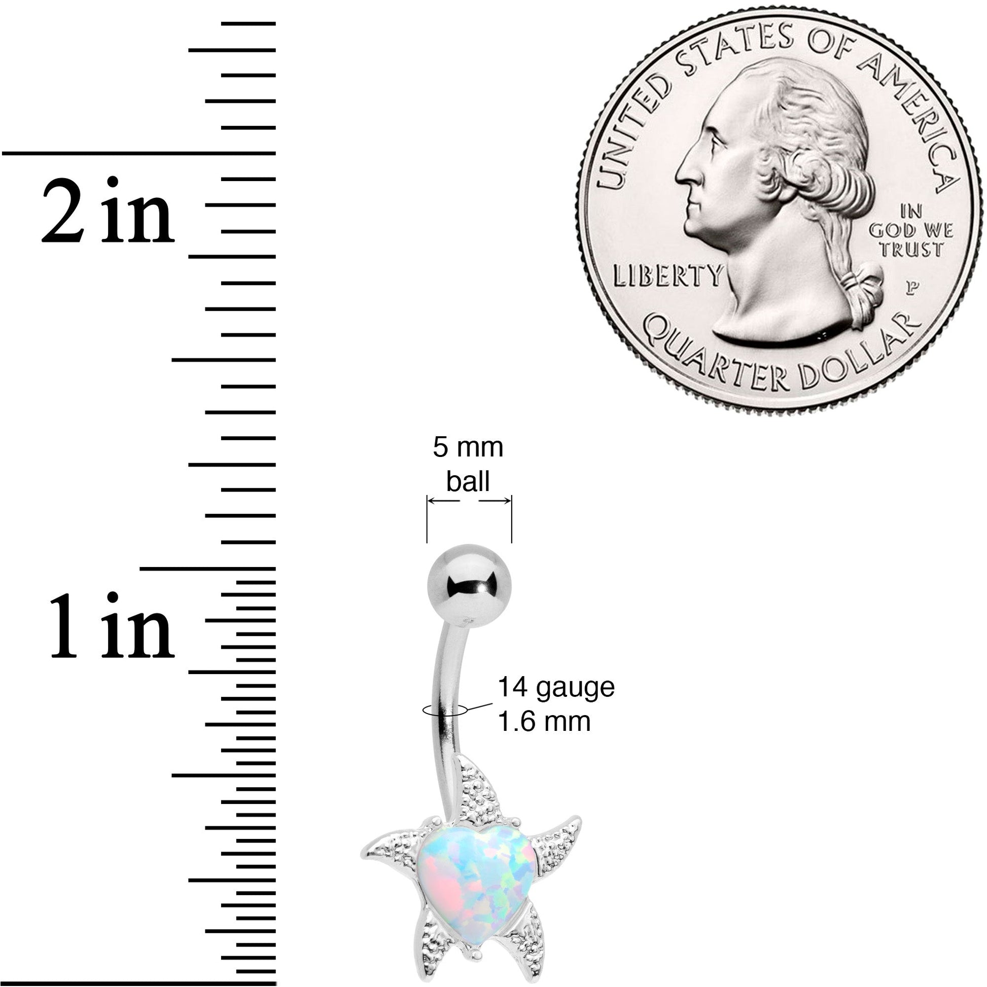 If you've got a soft spot for sea life this nautical navel jewelry will sweep you away like a tidal wave! The 14 gauge belly button ring is made with a 3/8" durable 316L surgical grade stainless steel curved barbell with a 5mm top ball end. The bottom end features a starfish charm set at its center with a heart-shaped white synthetic opal. Whether you're bound for the beach or obsessed with the ocean, this is a star you'll want shining in your navel piercing!Specifications