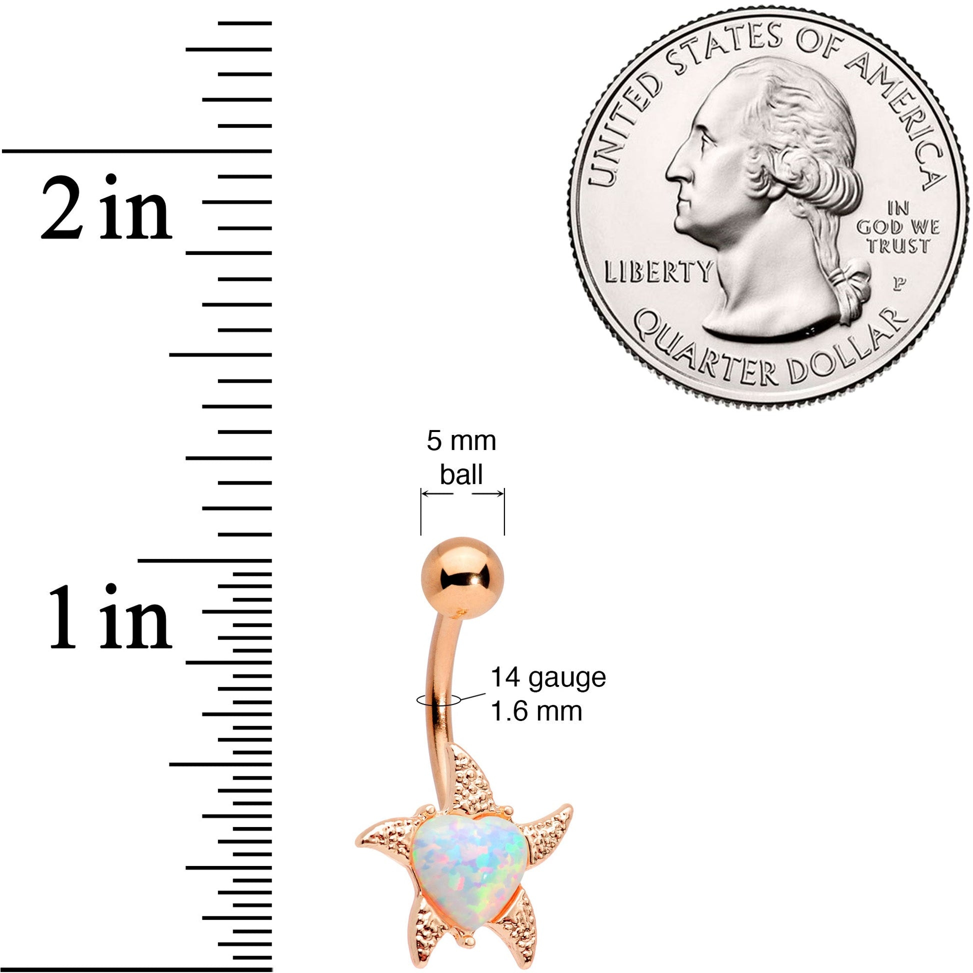 If you've got a soft spot for sea life this nautical navel jewelry will sweep you away like a tidal wave! The 14 gauge belly button ring is made with a 3/8" rose gold tone plated over 316L surgical grade stainless steel curved barbell with a 5mm top ball end. The bottom end features a starfish charm set at its center with a heart-shaped white synthetic opal. Whether you're bound for the beach or obsessed with the ocean, this is a star you'll want shining in your navel piercing!Specifications