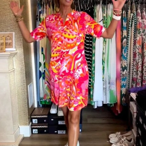 The dress features a graceful V-neck design that adds a touch of elegance. Its short sleeves make it ideal for both warmer days and layered looks during cooler months. Crafted from high-quality polyester, this dress offers a soft and breathable feel, making it perfect for all-day wear.